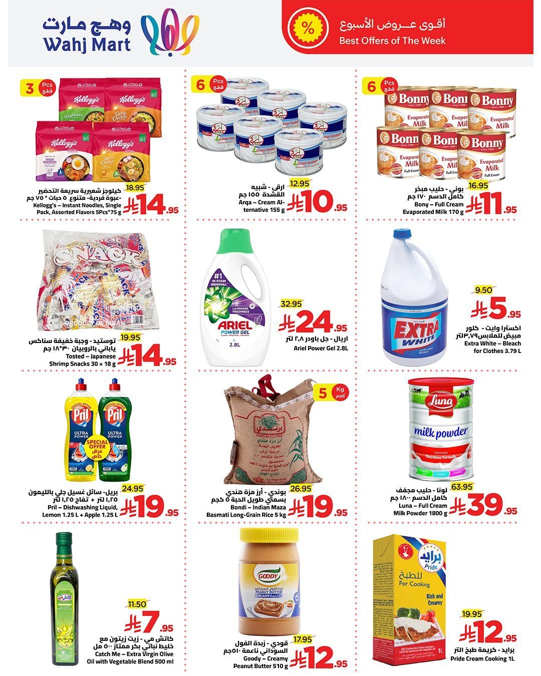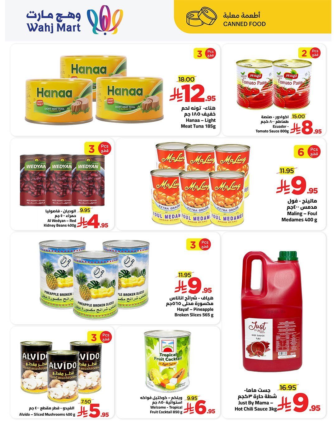 عروض وهج مارت الاسبوعية السبت 20 ديسمبر 2025 وتحتوي علي تشكيلة من تونة هناء والصلصة والحمص والفاصولياء والفول والأناناس وشرائح الفواكه المشكلة إلى جانب صلصة الفلفل الحار كما تضم أفضل عروض الأسبوع مجموعة من المنتجات الأساسية مثل حليب البودرة والأرز طويل الحبة والمنظفات المنزلية والزيوت النباتية