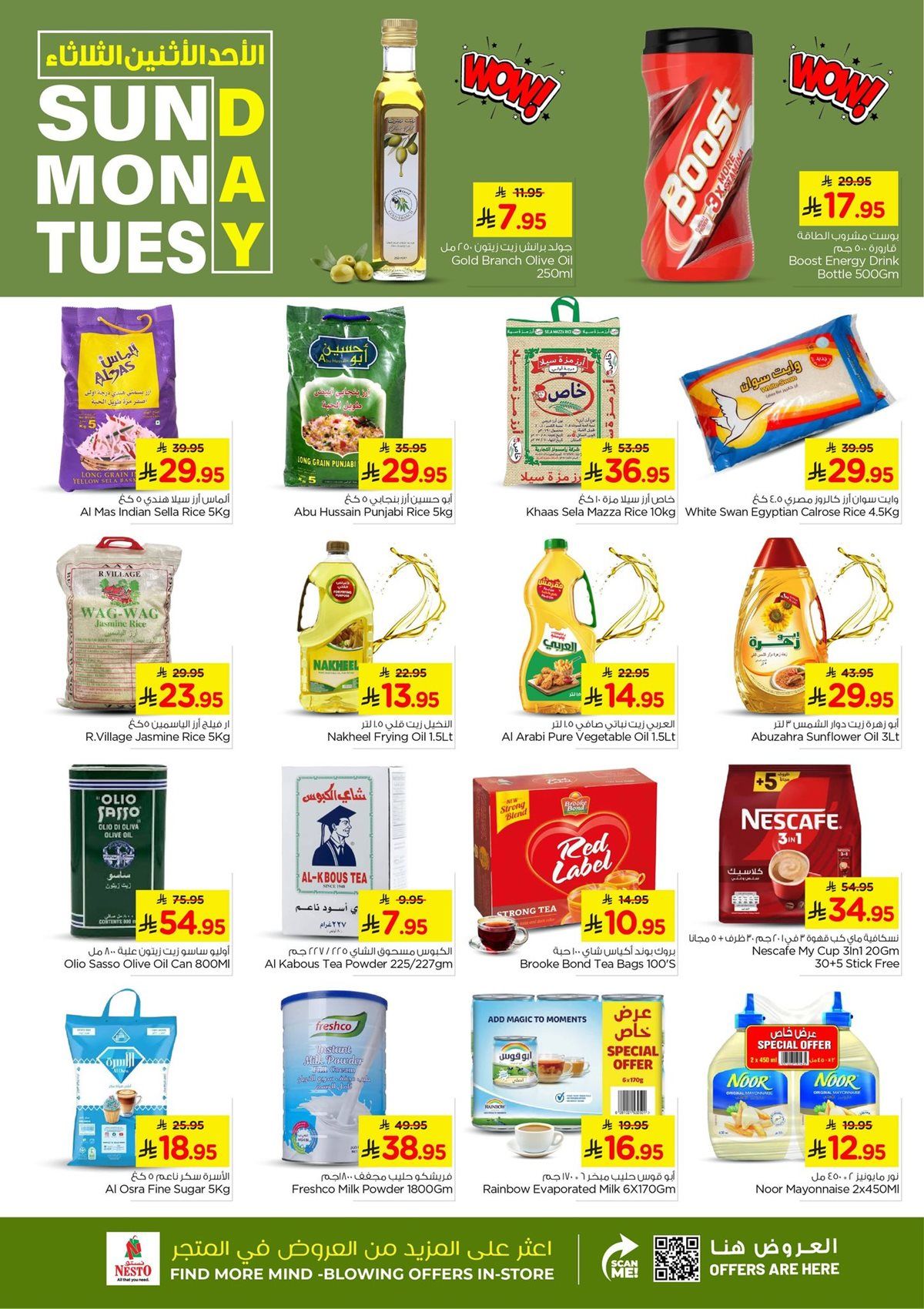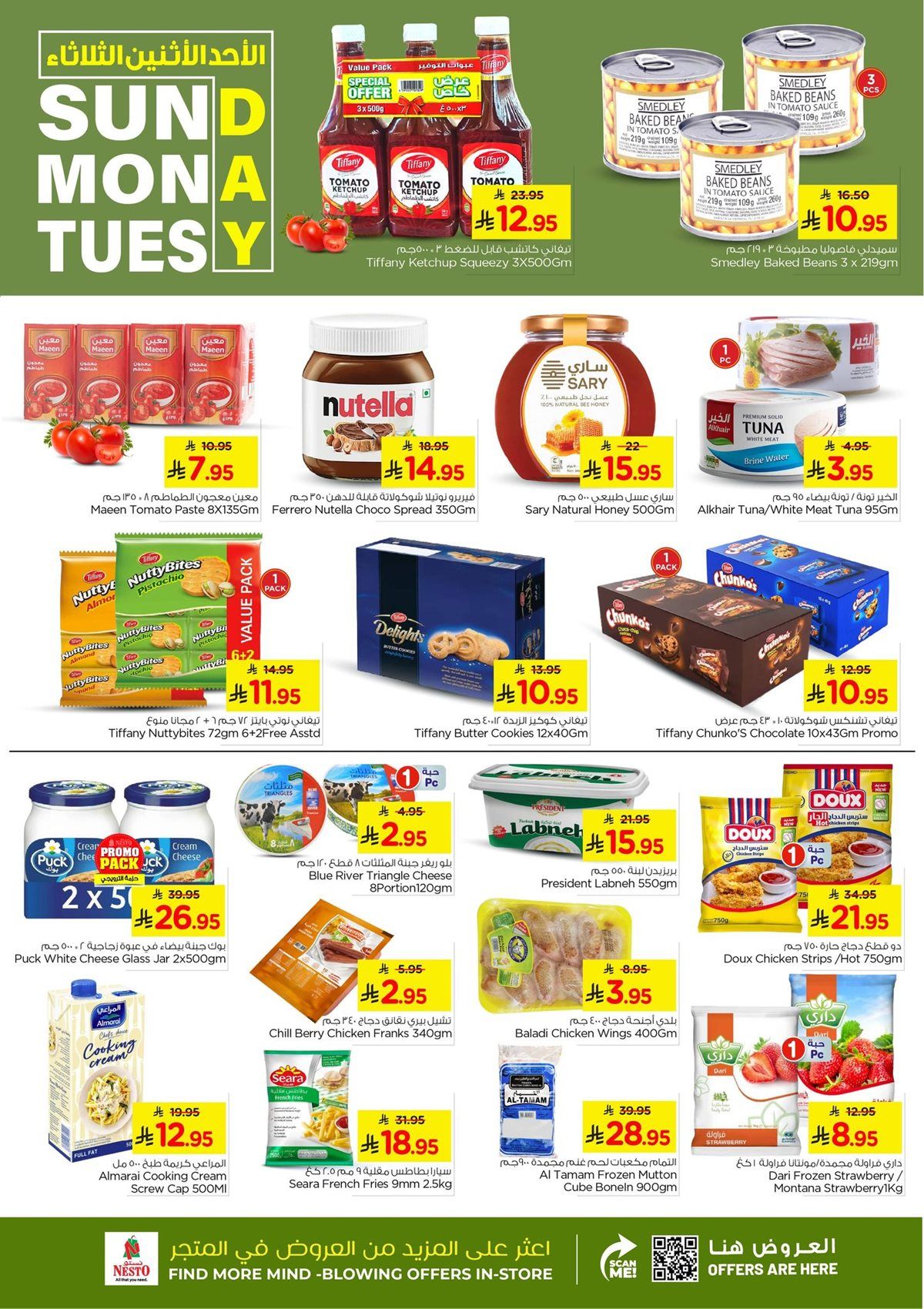 عروض نستو الدمام الطازج الاحد 1 رجب 1447هـ تشمل علي الأرز والزيت والسكر ومنتجات الألبان إضافة إلى المشروبات الساخنة والباردة بجانب الزيوت النباتية وزيت الزيتون والصلصات والمعلبات وتمتد لتشمل كمان الموز واللحوم الطازجة إلى جانب أصناف الدواجن المجمدة والقطع الجاهزة باقل الاسعار
