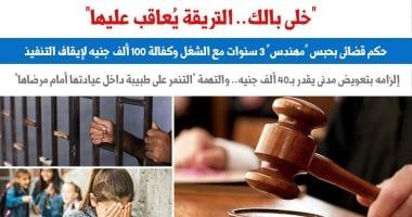 وإليكم التفاصيل كاملة:"خلى بالك التريقة أصبح يُعاقب عليها".. حكم قضائى بحبس "مهندس" 3 سنوات مع الشغل وكفالة 100 ألف جنيه لإيقاف التنفيذ.. وإلزامه بتعويض مدنى يقدر بـ40 ألف جنيه.. والتهمة "التنمر على طبيبة داخل عيادتها أمام مرضاها"