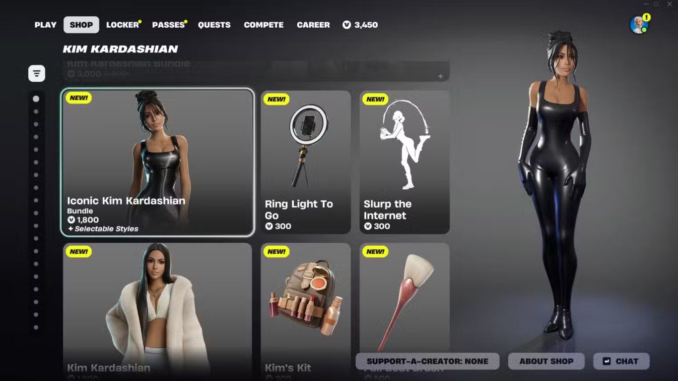 تشمل العناصر التجميلية المتاحة للشراء الفردي داخل Item Shop مظهر Iconic Kim Kardashian بسعر 1800 V Bucks. يتوافر عنصر Ring Light to Go بسعر 300 V Bucks. يتاح تعبير Slurp the Internet بسعر 300 V Bucks. يمكن شراء مظهر Kim Kardashian الأساسي بسعر 1500 V Bucks. يتوافر عنصر Kim Kit back bling بسعر 300 V Bucks. يمكن الحصول على أداة Full Beat Brush pickaxe بسعر 500 V Bucks. تتوافر أداة Bag Basher pickaxe بسعر 500 V Bucks. يتاح تعبير Diamond Drop بسعر 500 V Bucks. يمكن شراء طائرة Private Jet glider بسعر 800 V Bucks.