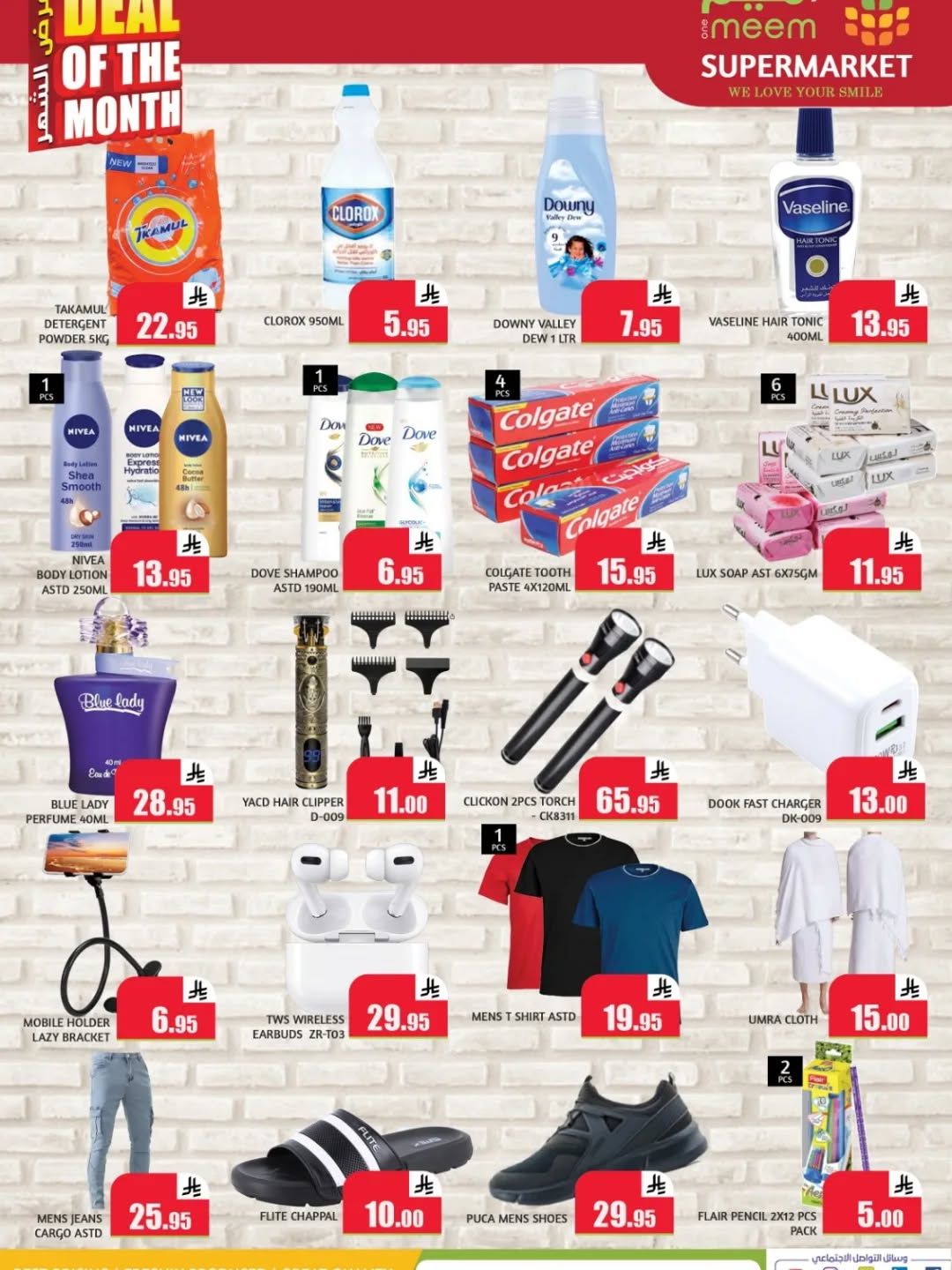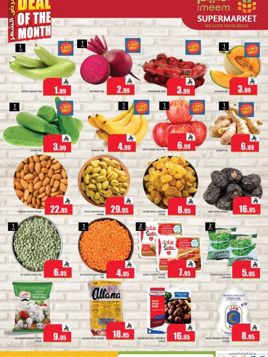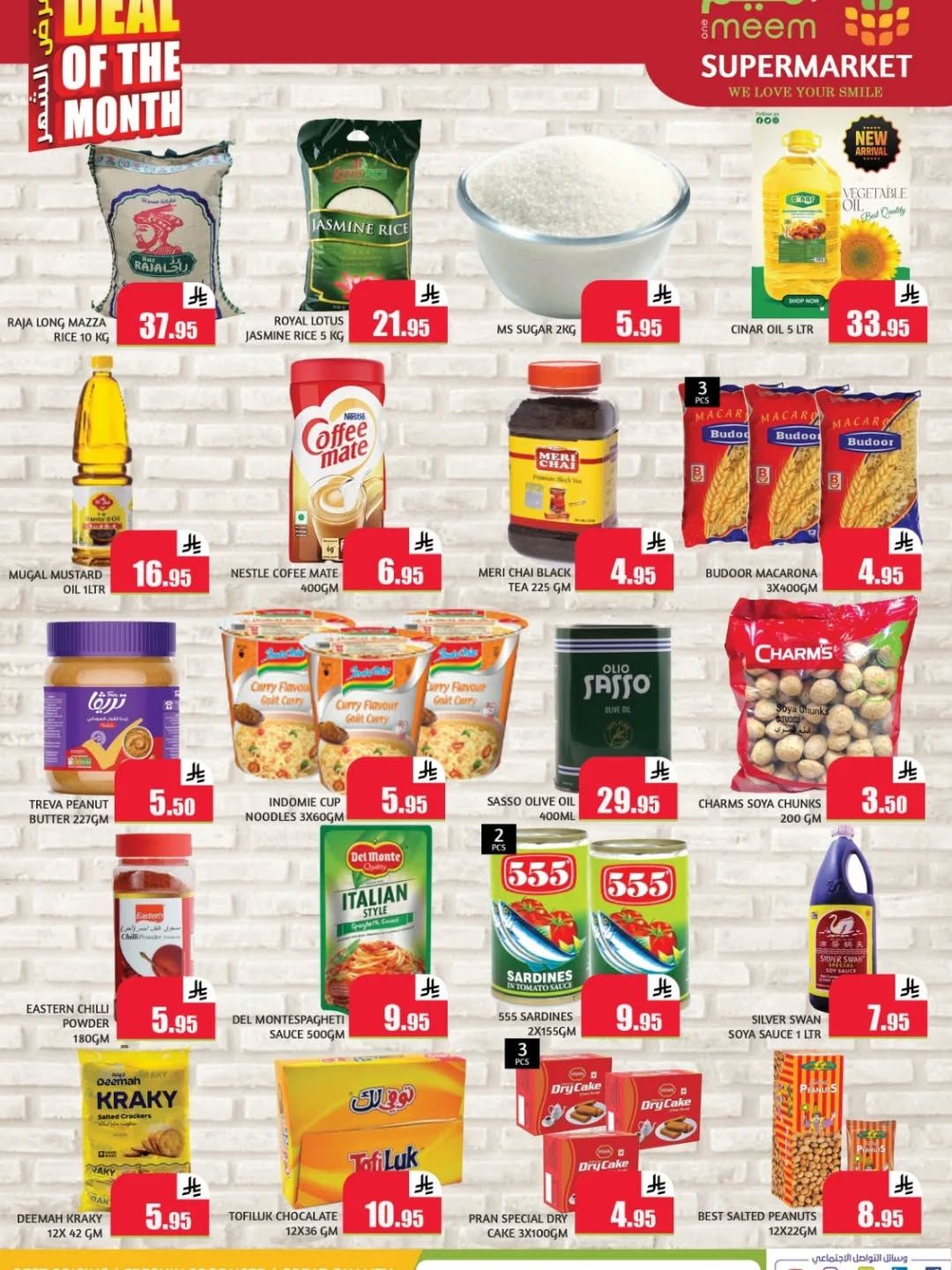 عروض وان ميم ماركت مستمرة حتي الثلاثاء 3 رجب 1447هـ و تحتوي علي تشمل الأرز والحليب والزيوت والمكسرات والدواجن والخضروات الطازجة و يتضمن كذلك تشكيلة من البقوليات والمعلبات والمكسرات والفواكه والخضروات مثل الطماطم والباذنجان والكرنب والموز والتفاح والفراولة إلى جانب العدس والبازلاء واللوز والفستق والتمور