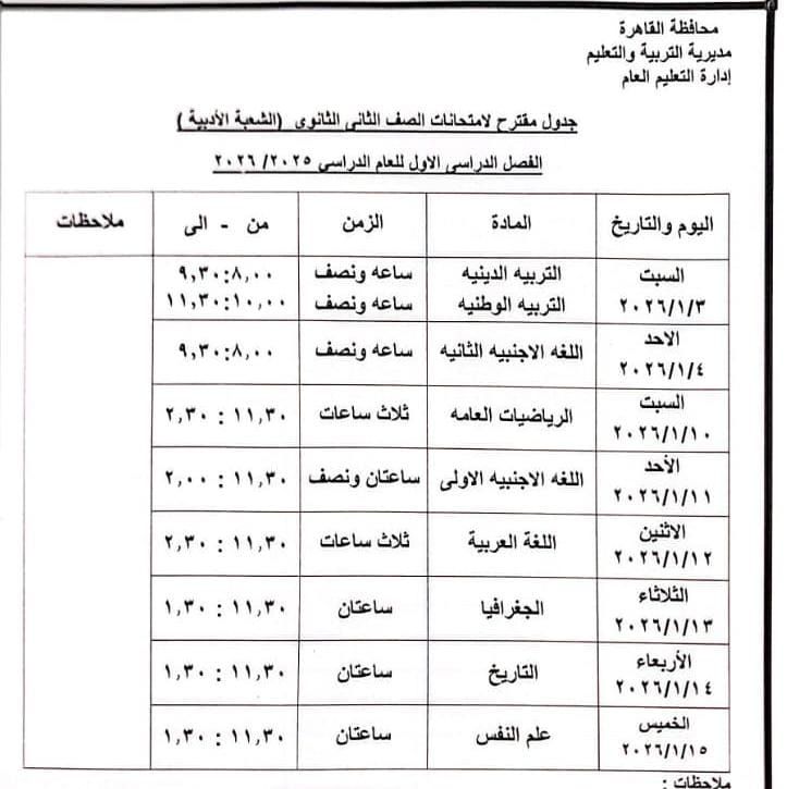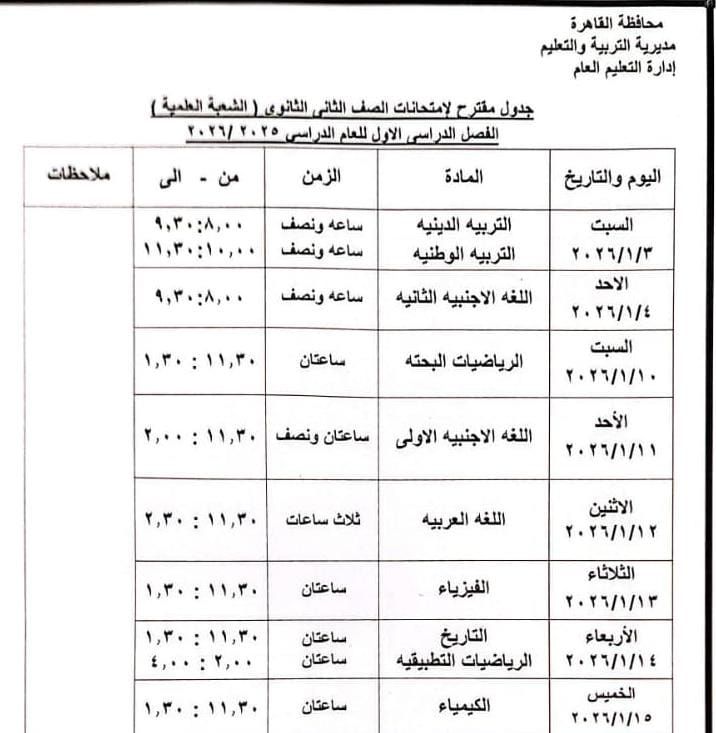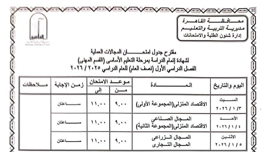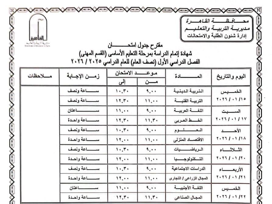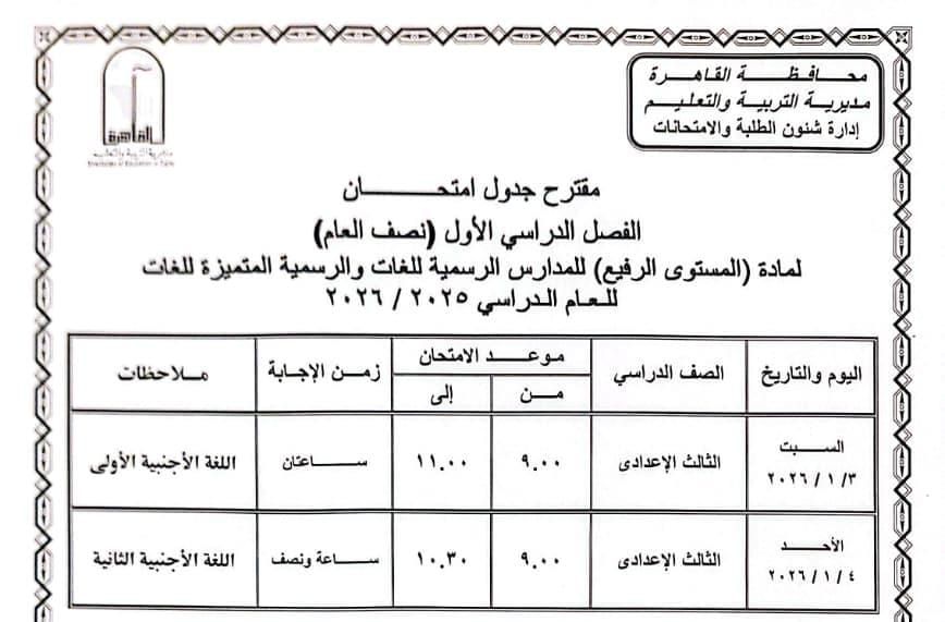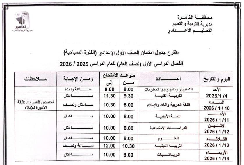 تبدأ امتحانات الشهادة الإعدادية العامة والرياضية، والصم، والمكفوفين، والمهنية من الخميس 15 يناير حتى الخميس 22 يناير 2026.