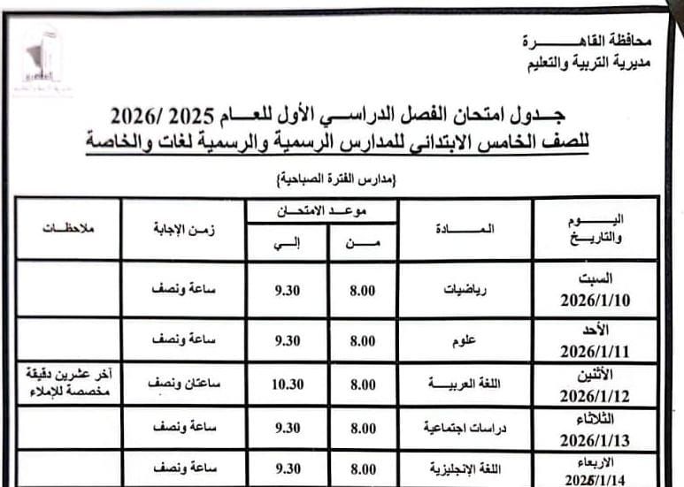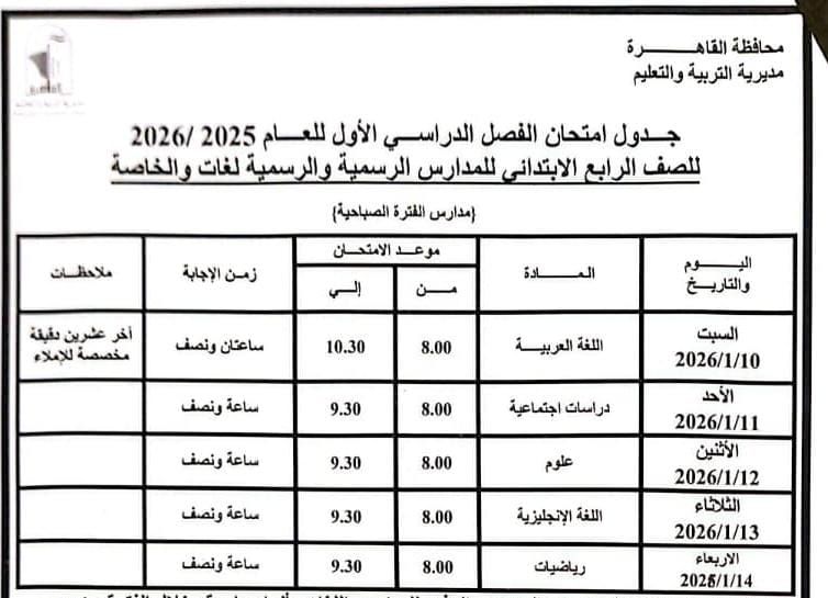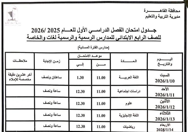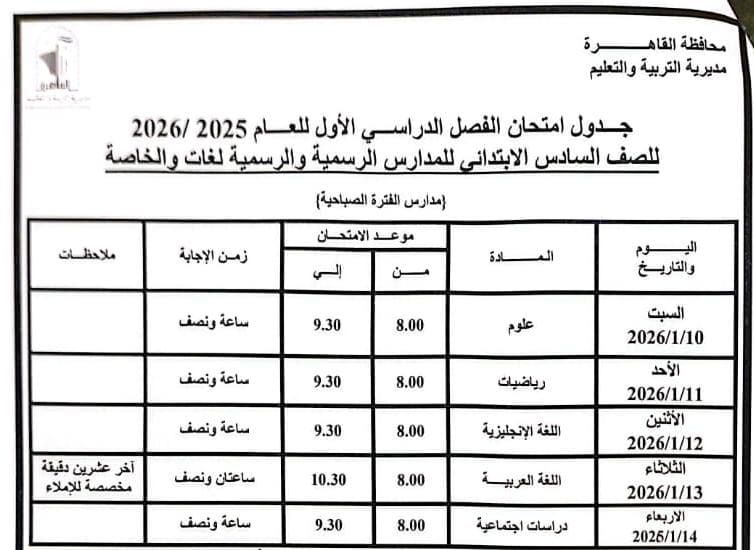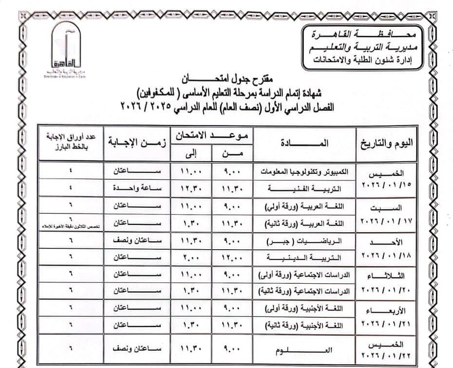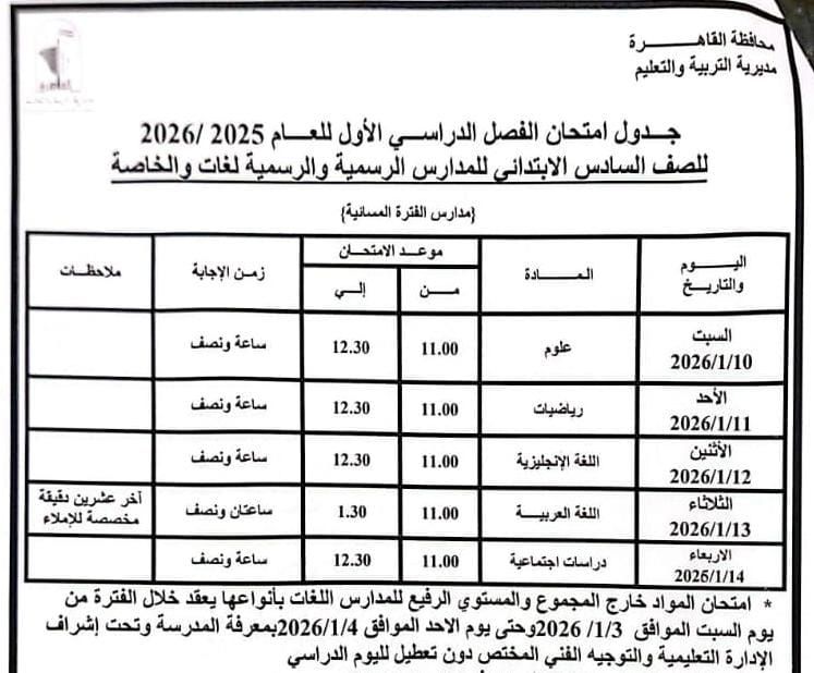 يؤدي تلاميذ الصفوف الرابع والخامس والسادس الابتدائي وما يعادلها الامتحانات من السبت 10 يناير حتى الأربعاء 14 يناير 2026.