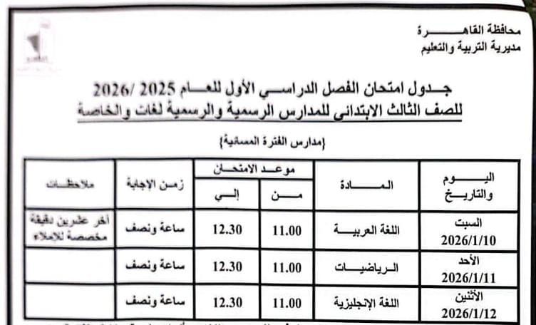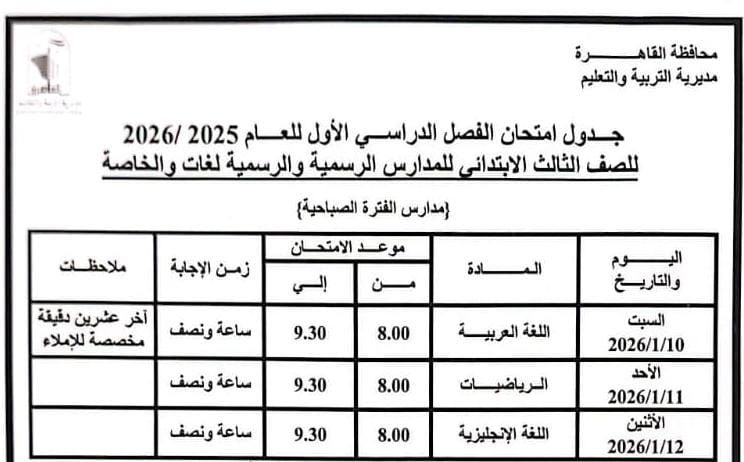 يؤدي تلاميذ الصف الثالث الابتدائي وما يعادله الامتحانات خلال الفترة من السبت 10 يناير حتى الاثنين 12 يناير 2026.