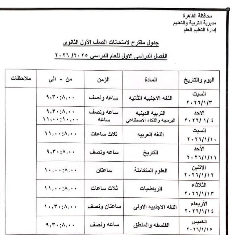 الأحد، 21 ديسمبر 2025 10:16 صاعتمد الدكتور إبراهيم صابر محافظ القاهرة، جدول امتحانات الفصل الدراسي الأول للعام الدراسي 2025 / 2026، بمختلف المراحل التعليمية، على مستوى محافظة القاهرة.