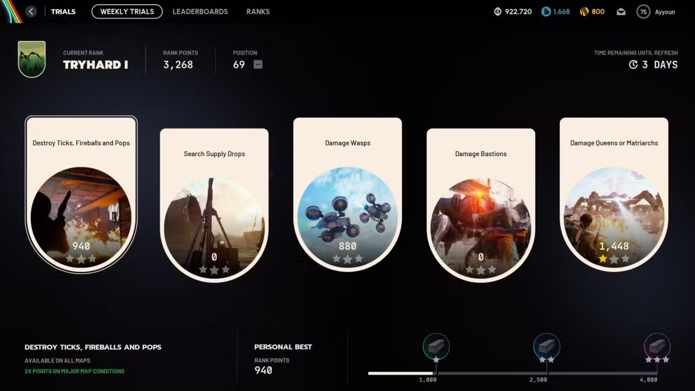 تقدم Weekly Trials في كل أسبوع خمسة تحديات مختلفة يتم تحديثها بشكل دوري. هذه التحديات تتنوع بين مهام قتالية وأنشطة استكشافية وجمع XP عبر أساليب لعب متعددة داخل الوضع العادي أو ضمن ظروف خرائط خاصة تمنح مضاعفة خبرة مثل 2X EXP. اختيار الظروف المناسبة يختصر الوقت المطلوب ويزيد من كفاءة الإنجاز.
