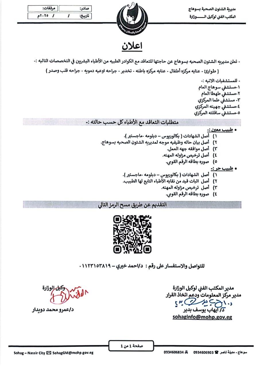 الإثنين، 22 ديسمبر 2025 10:03 صأعلنت مديرية الشؤون الصحية بمحافظة سوهاج، عن حاجتها للتعاقد مع عدد من الكوادر الطبية من الأطباء البشريين بعدد من التخصصات المختلفة، وذلك في إطار دعم المنظومة الصحية وسد العجز بالمستشفيات التابعة للمديرية.