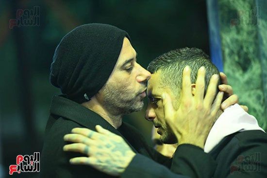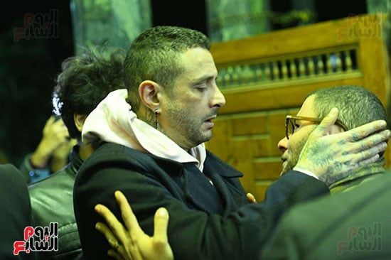أحمد الفيشاوي يقبل شقيقه عمر الفيشاوي في عزاء والدتهما سمية الألفي