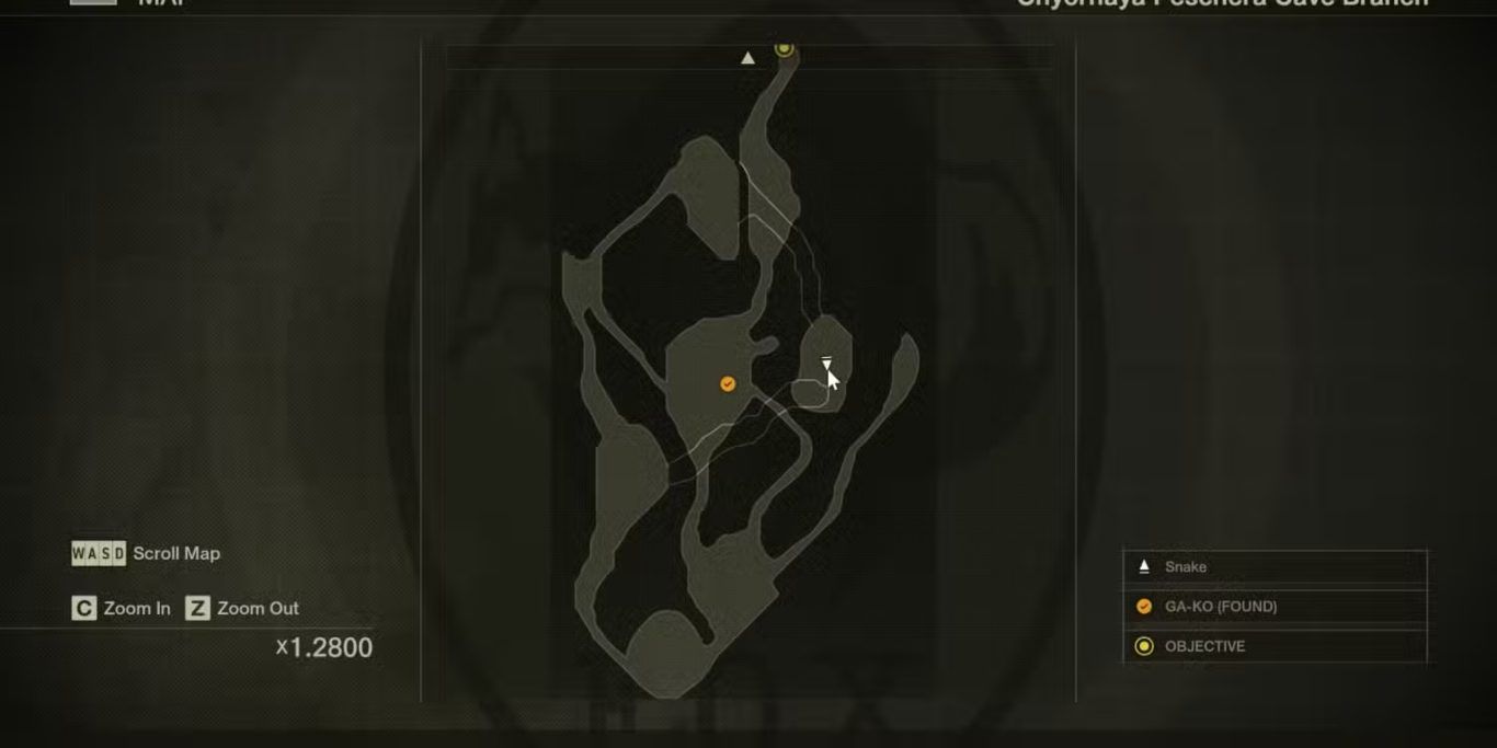 بعد معركة زعيم مع Revolver Ocelot، يبدأ مشهد سينمائي، ثم يستعيد اللاعبون التحكم في Snake داخل فرع كهوف Chyornaya Peschera. عند دخول الكهف، بالكاد يتمكن اللاعبون من رؤية أي شيء إلى أن تتكيف عينا Snake مع الظلام، وحتى بعد ذلك يظل نظام الكهوف مظلمًا إلى حد كبير. فور ظهور اللاعبين داخل الكهوف، يتجهون إلى التجويف الموجود على اليمين، ثم يسلكون المسار الأيسر المباشر. يلتزمون بالجهة اليسرى للدخول عبر فتحة ضيقة في جدران الكهف، ثم يتبعون المنحدر صعودًا نحو اليمين، حيث يتعيّن الاستلقاء والزحف عبر فجوة في الجدار. على الجهة الأخرى، يتم المرور عبر الفجوة التالية في الجدار، وعند الخروج منها، توجد نظارات الرؤية الليلية إلى جانب ذخيرة لسلاح AK 47.