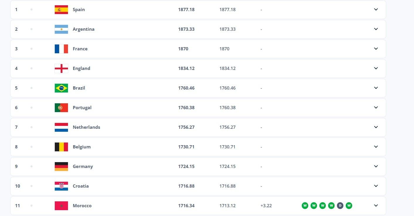 ورغم هذا الإنجاز بقي "أسود الأطلس" على بعد خطوة واحدة من دخول نادي العشرة الأوائل، إذ يفصلهم عن المنتخب الكرواتي صاحب المركز العاشر فارق ضئيل جدا لا يتجاوز 0.54 نقطة.