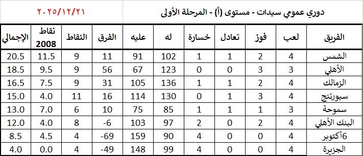 الشمس يتصدر ترتيب دورى عمومى سيدات اليدويتواجد الشمس فى المركز الأول برصيد 9 نقاط ، يليه الأهلى فى المركز الثانى بنفس الرصي و يتبقى لع لقاء مؤجل بينما يحل الزمالك ثالثا برصيد 9 نقاط أيضا لفارق الأهداف .