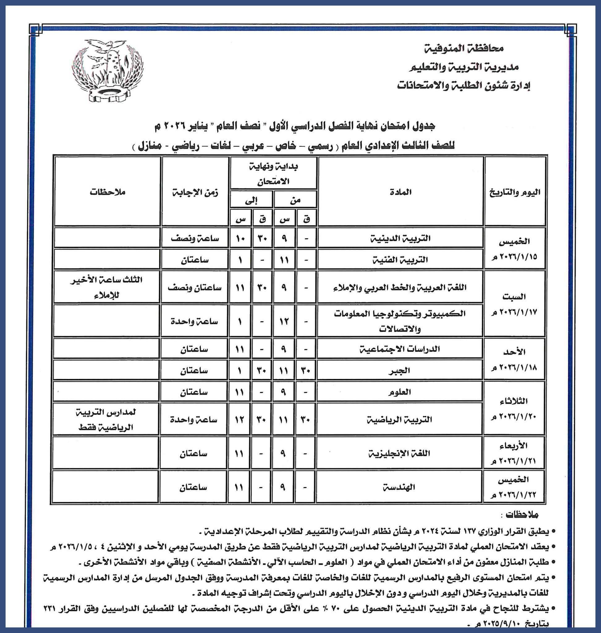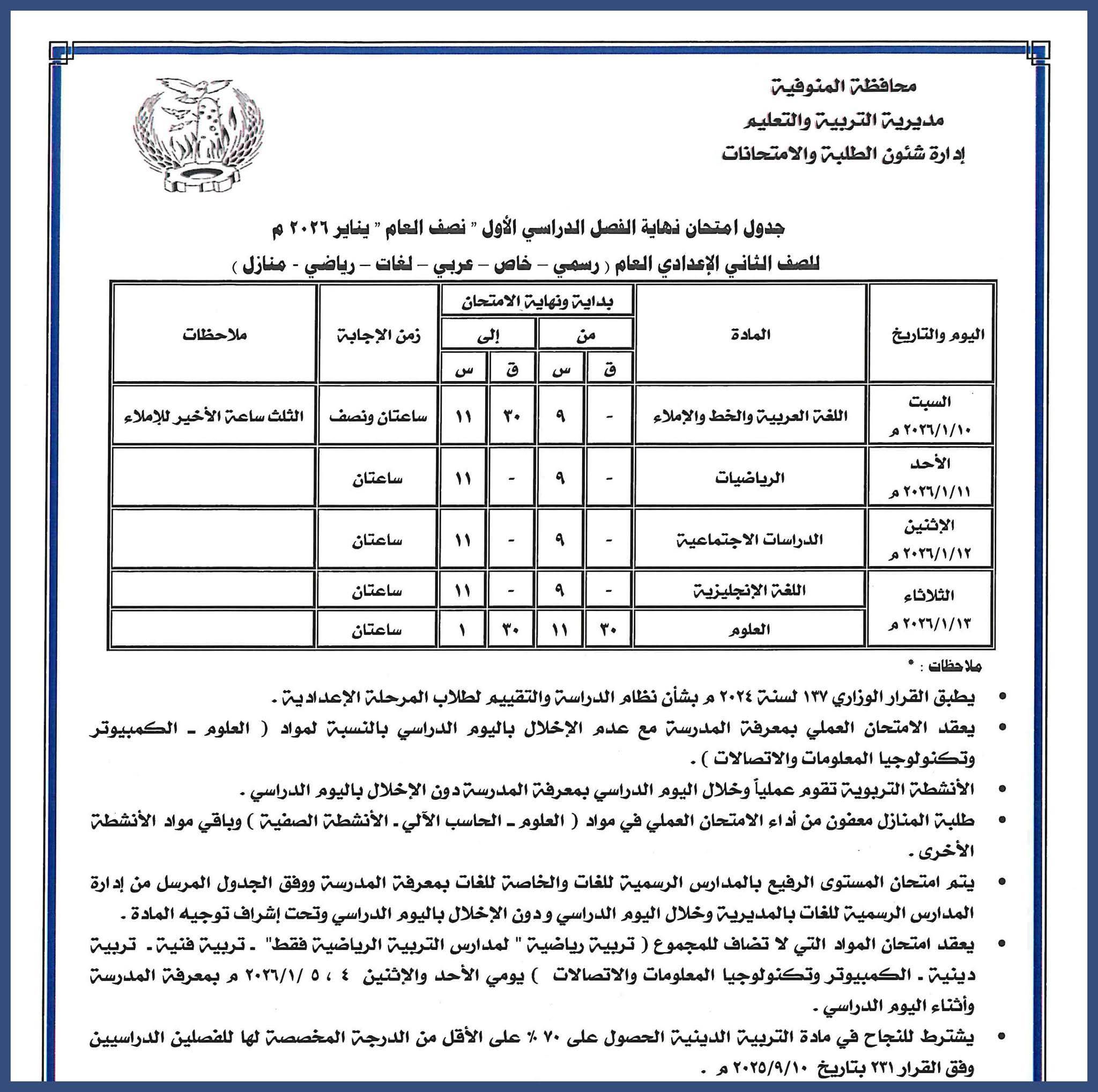واعتمد اليوم اللواء إبراهيم أبو ليمون محافظ المنوفية جداول امتحانات الفصل الدراسي الأول دور يناير للعام الدراسى 2025 / 2026 لصفوف المراحل التعليمية المختلفة بكافة الادارات التعليمية بنطاق المحافظة ، بحضور الدكتور محمد صلاح وكيل وزارة التربية والتعليم بالمحافظة.