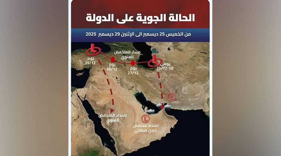 يتوقع المركز الوطني للأرصاد، أن تشهد الدولة خلال الفترة من 25 إلى 29 ديسمبر/ كانون الأول الجاري أجواءً لطيفة ومعتدلة، تميل إلى البرودة ليلاً، مع مرور امتداد منخفض جوي ضعيف، يصاحبه تدفّق للسحب المتوسطة والمنخفضة، مع فرصة لسقوط أمطار خفيفة إلى متوسطة على فترات متباعدة، تتركز على الجزر والمناطق الشمالية، وقد تكون غزيرة أحياناً على أقصى شمال الدولة.