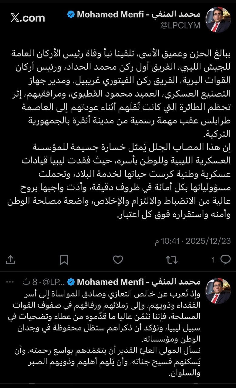 أكد رئيس المجلس الرئاسي الليبي محمد المنفي تلقيه بمزيد من الحزن نبأ وفاة رئيس الأركان العامة للجيش الليبي، الفريق أول ركن محمد الحداد، ورئيس أركان القوات البرية، الفريق ركن الفيتوري غريبيل، ومدير جهاز التصنيع العسكري، العميد محمود القطيوي، ومرافقيهم، إثر تحطّم الطائرة التي كانت تُقلّهم أثناء عودتهم إلى العاصمة طرابلس عقب مهمة رسمية من مدينة أنقرة بالجمهورية التركية.‏