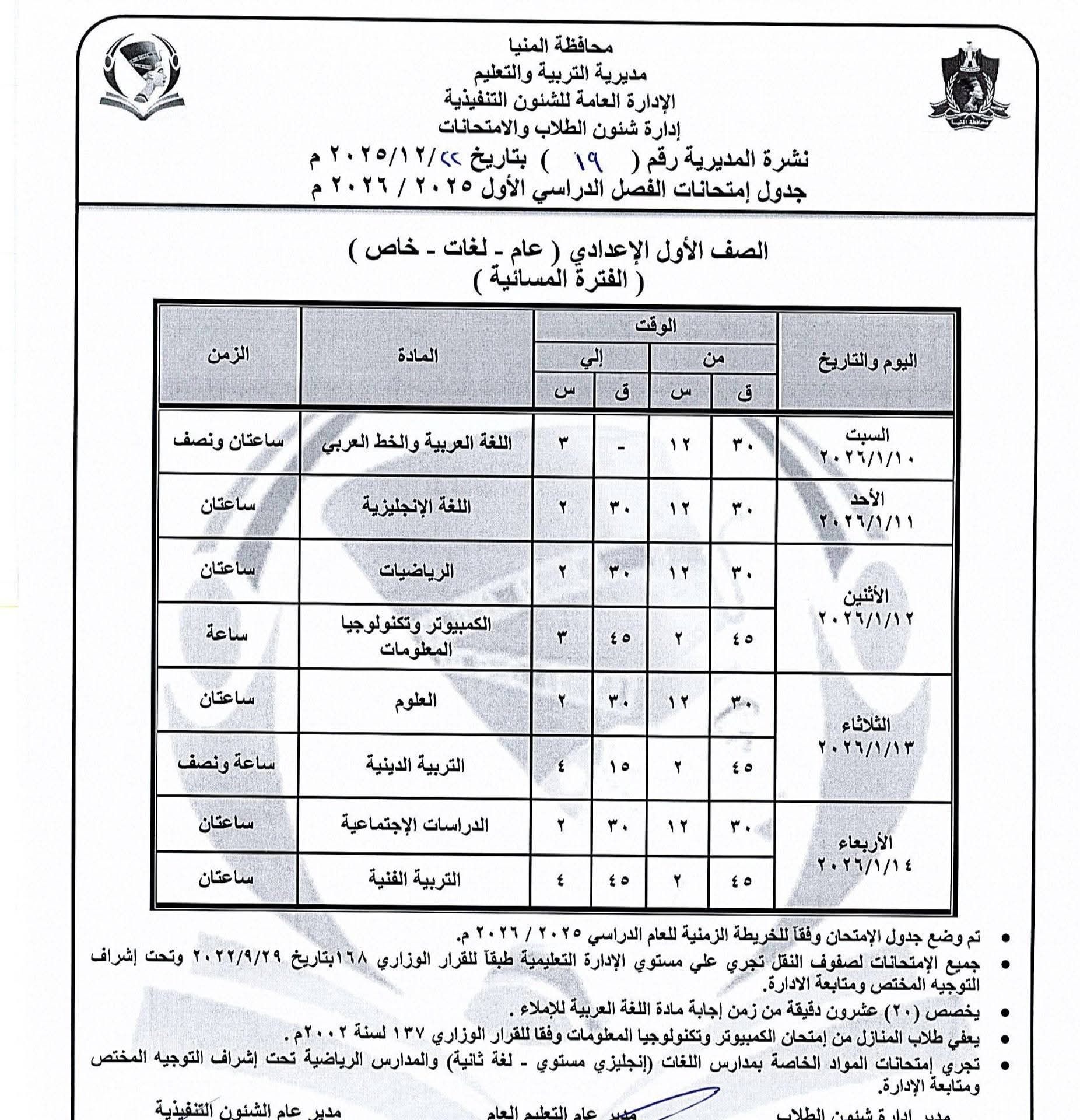 الأربعاء، 24 ديسمبر 2025 12:20 مينشر اليوم السابع جدول إمتحانات الفصل الدراسى الأول للمرحلة الإعدادية بمحافظة المنيا، 2025/ 2026،والتى سوف تبدأ يوم 10 يناير.