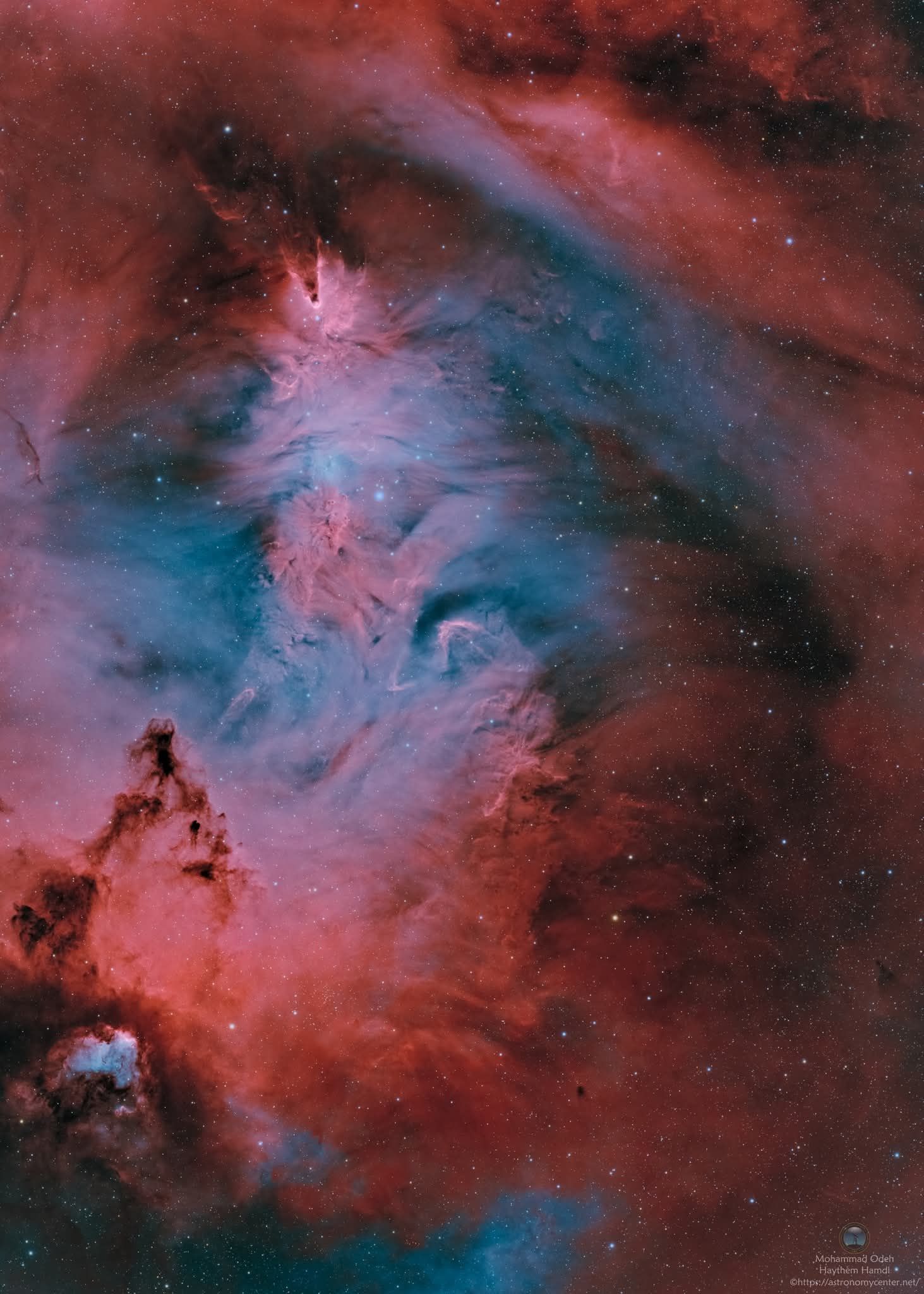 الأربعاء، 24 ديسمبر 2025 04:42 مبعد 35 ساعة تصوير على مدى أكثر من شهر، تمكن مرصد الختم الفلكى الواقع فى صحراء أبوظبى من التقاط صورة مميزة لبقعة من السماء تحتوى على العديد من الأجرام السماوية، ومنها عنقود الشجرة، وهو تجمع من النجوم الذي يبدو على هيئة شجرة، ويعرف عند المجتمعات الغربية باسم "عنقود شجرة عيد الميلاد" للشبه بينه وبين شجرة عيد الميلاد، وإلى الأعلى من العنقود يقع سديم المخروط، وهو عبارة عن كتلة من الغاز والغبار على هيئة مخروط.