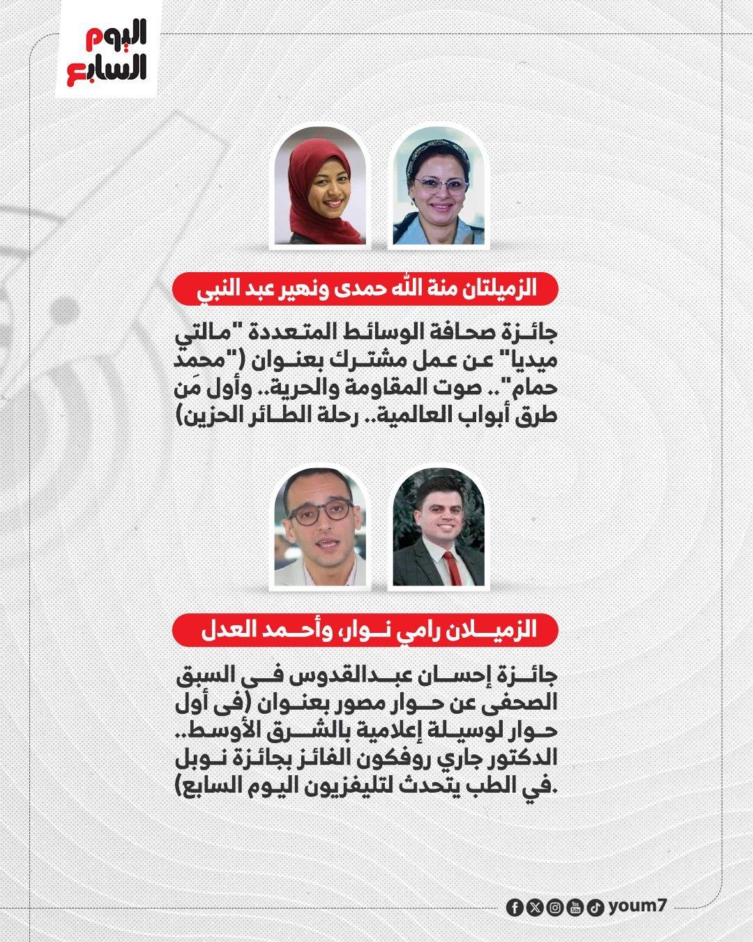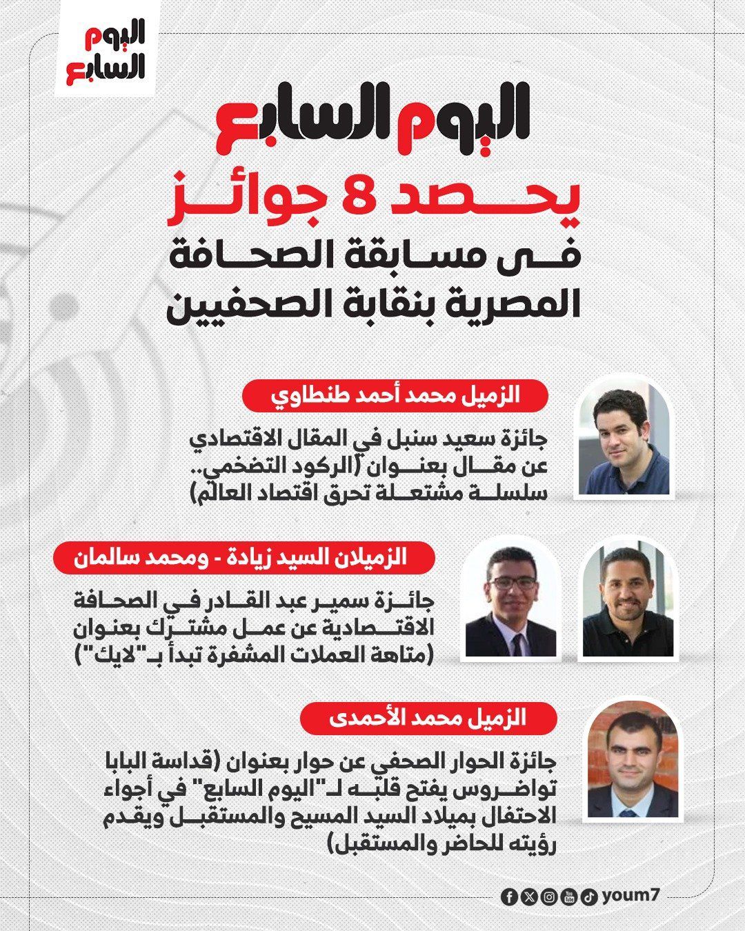 وحصدت "اليوم السابع"، 8 جوائز فى مسابقة جوائز الصحافة المصرية بنقابة الصحفيين، "دورة محمود عوض 2025م" حيث حصل الزميل محمد الأحمدى جائزة الحوار الصحفى عن حوار بعنوان (قداسة البابا تواضروس يفتح قلبه لــ"اليوم السابع" فى أجواء الاحتفال بميلاد السيد المسيح والمستقبل ويقدم رؤيته للحاضر والمستقبل).