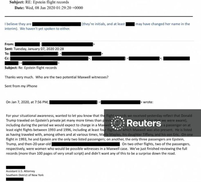 كما شملت الملفات إشارات أخرى إلى ترامب، من بينها رسالة بريد إلكتروني تفيد بأنه سافر على متن طائرة خاصة مع نساء كان من الممكن أن يكنّ شاهدات في القضية ضد شريكته غيسلين ماكسويل.