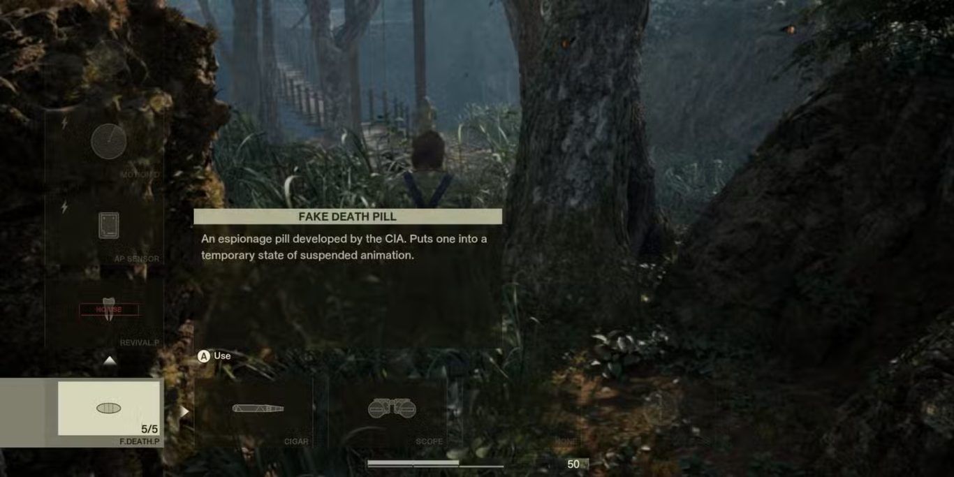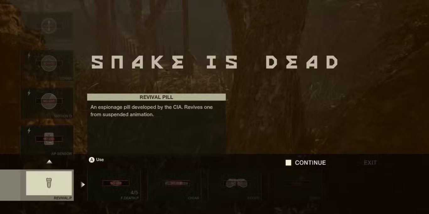 نصيحة : يؤدي استخدام حبوب الموت إلى فتح إنجاز Mostly Dead في Metal Gear Solid Delta Snake Eater.