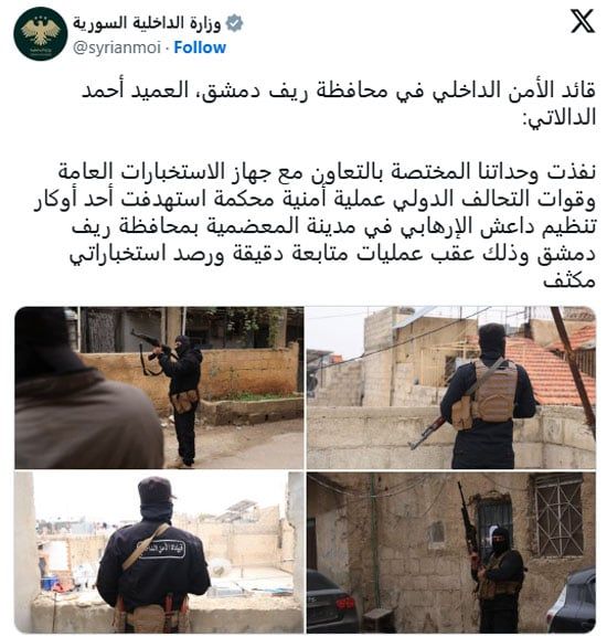 من جهته، قال العميد أحمد الدالاتي قائد الأمن الداخلي في محافظة ريف دمشق، في تصريح له أوردته وزارة الداخلية عبر حسابها بمنصة "إكس": "نفذت وحداتنا المختصة بالتعاون مع جهاز الاستخبارات العامة وقوات التحالف الدولي عملية أمنية محكمة".