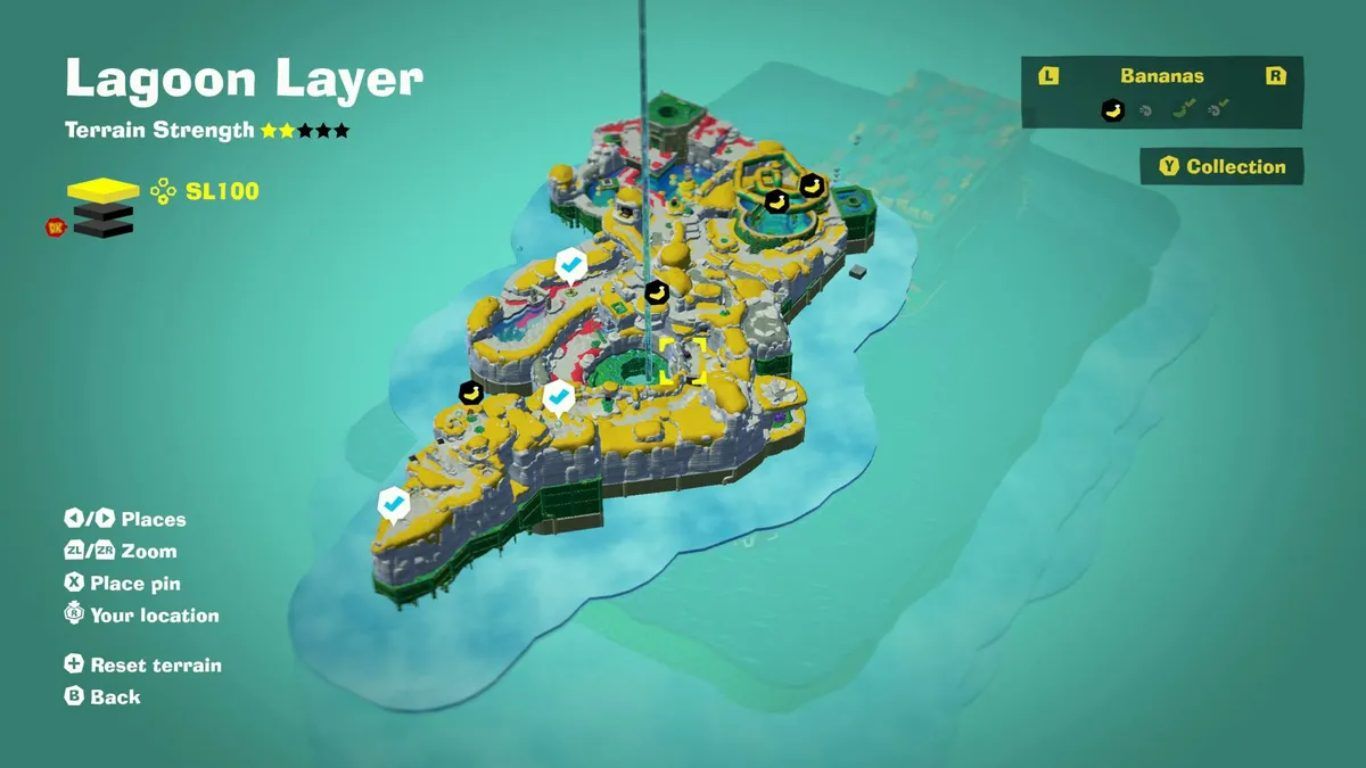 عند تحديد أي موقع موز على الخريطة يمكن للاعب الوقوف بالمؤشر فوق العلامة والضغط على زر X لتثبيت الموقع. يؤدي هذا الإجراء إلى ظهور العلامة تلقائيا عند الضغط المستمر على زر L للحصول على مساعدة الملاحة المصحوبة بالموسيقى مما يوجه اللاعب بشكل شبه مباشر نحو موقع الموز المحدد. تساعد هذه الميزة على تقليل وقت البحث وتجنب الضياع داخل الطبقات المعقدة خاصة عند استكشاف مناطق واسعة أو متداخلة.