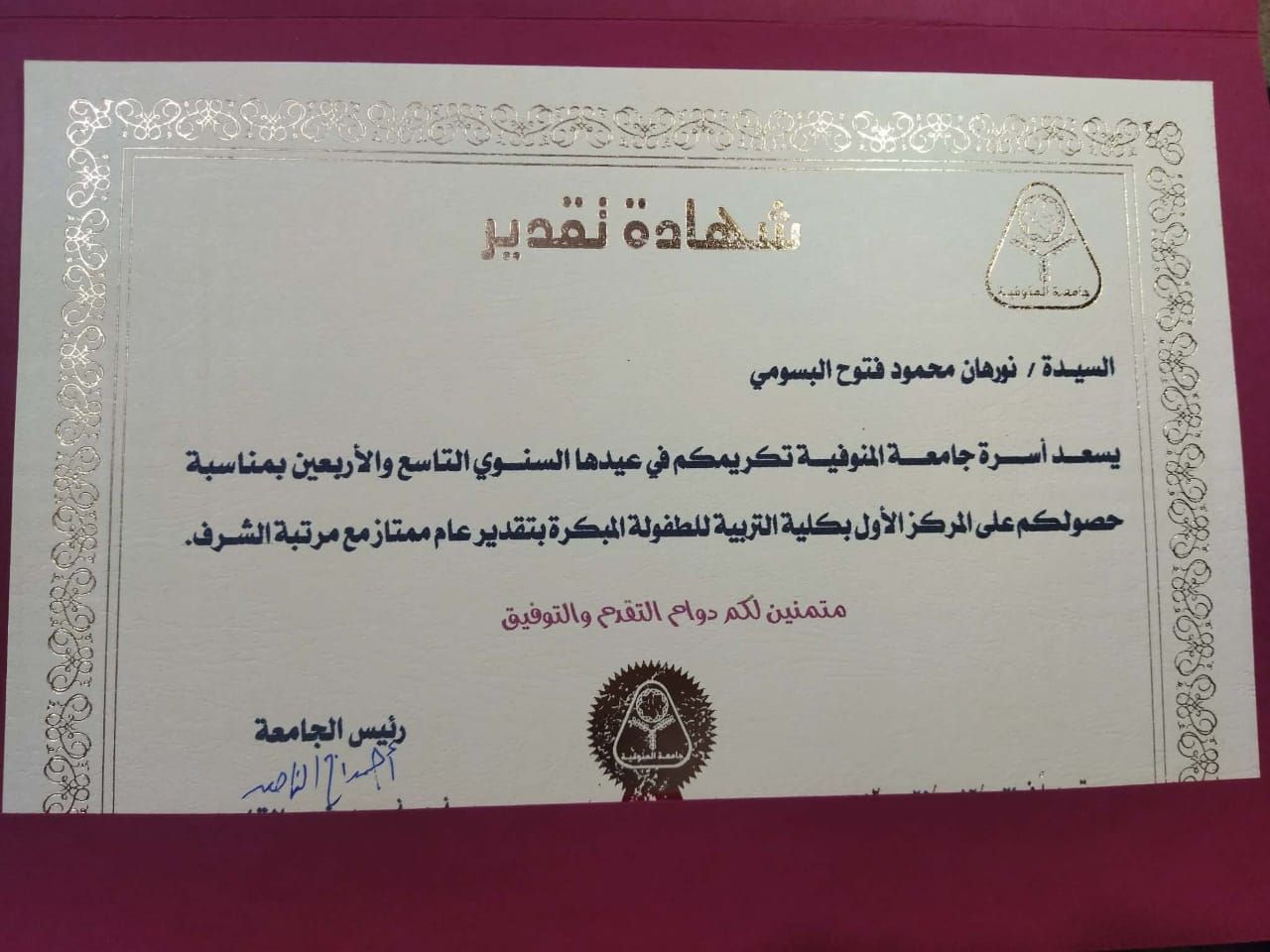 الخميس، 25 ديسمبر 2025 12:10 صحققت الطالبة نورهان محمود إنجازًا أكاديميًا متميزًا بحصولها على المركز الأول بكلية التربية للطفولة المبكرة بجامعة المنوفية، بتقدير عام امتياز مع مرتبة الشرف، وذلك خلال حفل تكريم رسمي أقيم بحضور السيد اللواء محافظ المنوفية، والسيد رئيس الجامعة، والسادة نواب رئيس الجامعة، إلى جانب نخبة من أساتذة جامعة المنوفية.