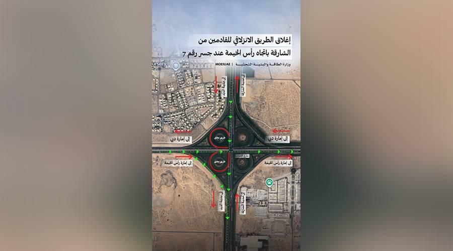 أعلنت وزارة الطاقة والبنية التحتية، عن إغلاق مسار للقادمين من إمارة الشارقة باتجاه إمارة رأس الخيمة عند الجسر رقم (7)، على شارع الإمارات، اعتباراً من يوم الأحد الموافق 28 ديسمبر، 2025، بسبب تنفيذ أعمال تطويرية على شارع الإمارات.