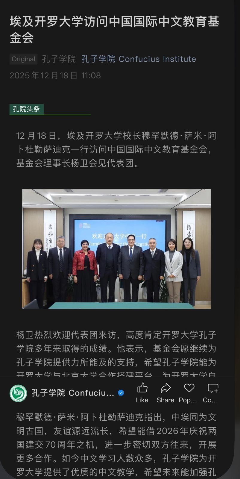 لقاءات رئيس جامعة القاهرة بقيادات جامعة بكين ومؤسسات التعليم الصينى تمثل نموذجا للشراكة التعليميةكما تناولت التغطيات الإعلامية، لقاءات د.محمد سامى عبدالصادق رئيس جامعة القاهرة مع قيادات جامعة بكين، والمؤسسة الصينية للتعليم الدولي للغة الصينية، ومركز التبادل الدولي للتعليم اللغوي، كما أثنى الجانب الصيني على الدور الريادي الذي تقوم به جامعة القاهرة ومعهد كونفوشيوس في نشر وتعليم اللغة والثقافة الصينية، وأكدت أن هذه اللقاءات تمثل نموذجًا متميزًا للشراكة التعليمية الدولية وتعكس عمق العلاقات التاريخية والأكاديمية بين مصر وجمهورية الصين الشعبية.
