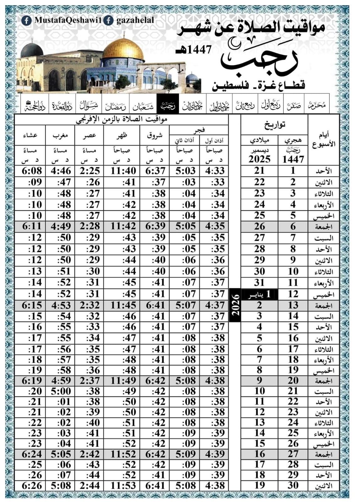 امساكية رجب ومواعيد الصلاة في قطاع غزة - فلسطين