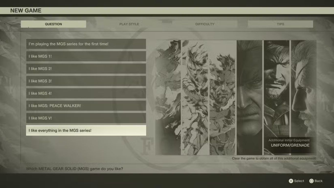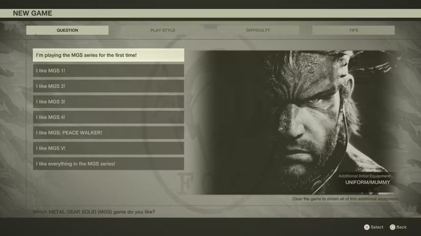 عند بدء ملف حفظ جديد في Metal Gear Solid Delta: Snake Eater، تُطرح عليك لعبة سؤالًا حول لعبة MGS التي تفضلها، مع ثمانية خيارات متاحة للاختيار.