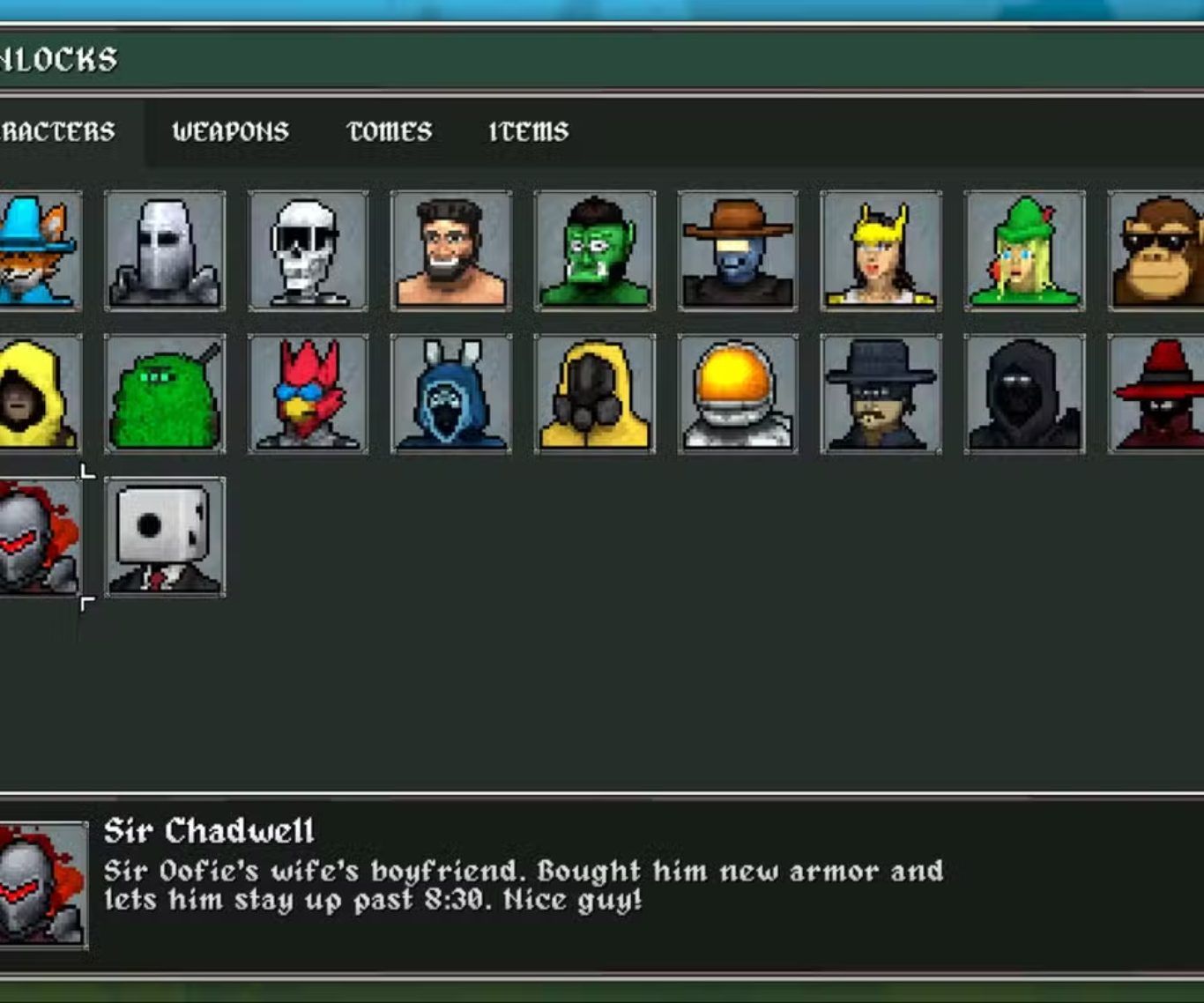 | Sir Oofie | متاحة من البداية | لا يوجد | السلاح الافتراضي Sword زيادة الدرع واحد بالمئة لكل مستوى |