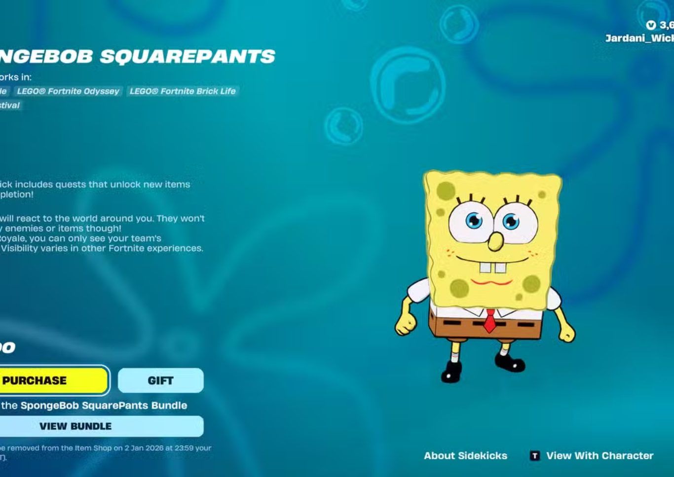 سيكون أمام اللاعبين فرصة لشراء عناصر SpongeBob التجميلية داخل لعبة Fortnite حتى تاريخ January 1 2026 الساعة السابعة مساء بتوقيت ET وبعد هذا الموعد ستغادر هذه العناصر متجر Item Shop ولن تكون متاحة للشراء.