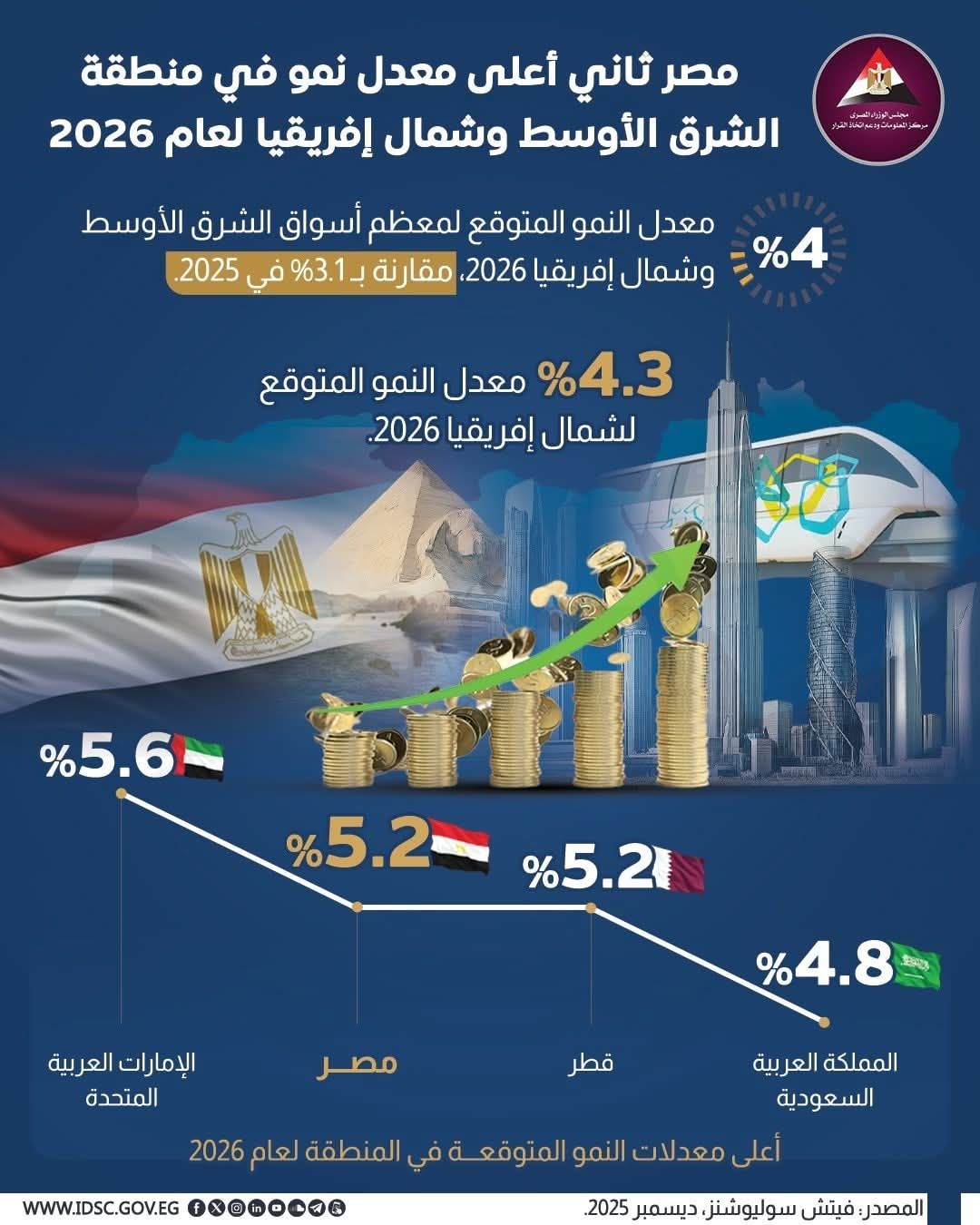 واوضح الانفوجراف ان مصر ثاني أعلى دولة من حيث معدل النمو في منطقة الشرق الأوسط وشمال إفريقيا لعام 2026، مع توقعات بنمو اقتصادي يبلغ 5.2%. وأشار الانفوجراف ان معدل النمو المتوقع لمعظم أسواق الشرق الأوسط وشمال أفريقيا 4% خلال عام 2026.وجاء في المركز الأول الأول دولة الإمارات والمركز الثاني مصر والمركز الثالث دولة قطر والمركز الرابع المملكة العربي السعودية.