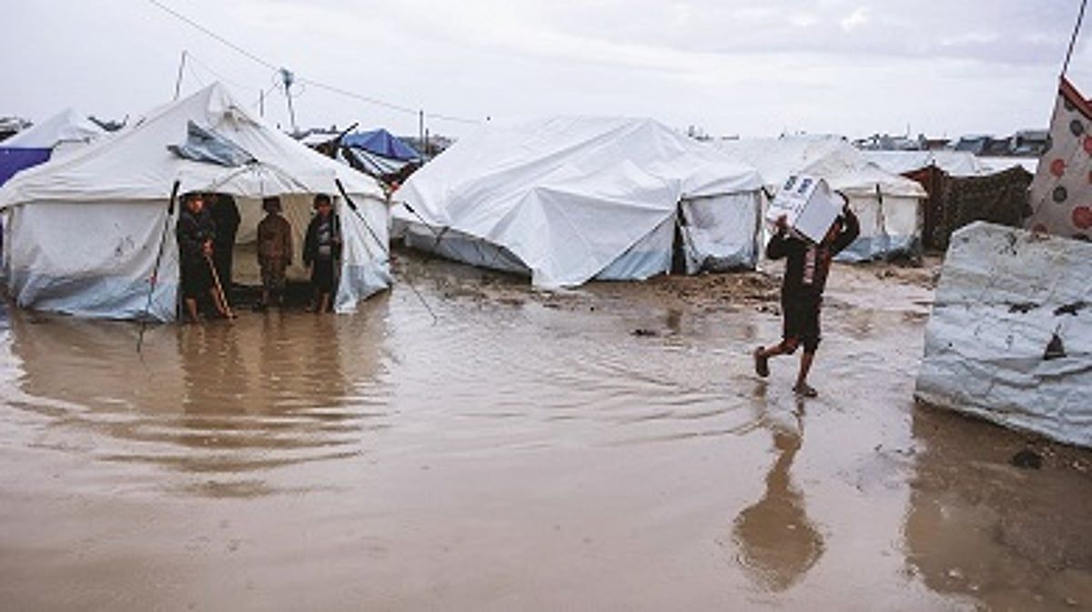 أغرقت الأمطار خيام النازحين الفلسطينيين في مدينة غزة، ودمرت الرياح مئات أخرى، مع استمرار المنخفض الجوي الذي يضرب المنطقة، منذ يوم أمس، في ظل نقص الإمكانات، وغياب وسائل الحماية من البرد والأمطار.