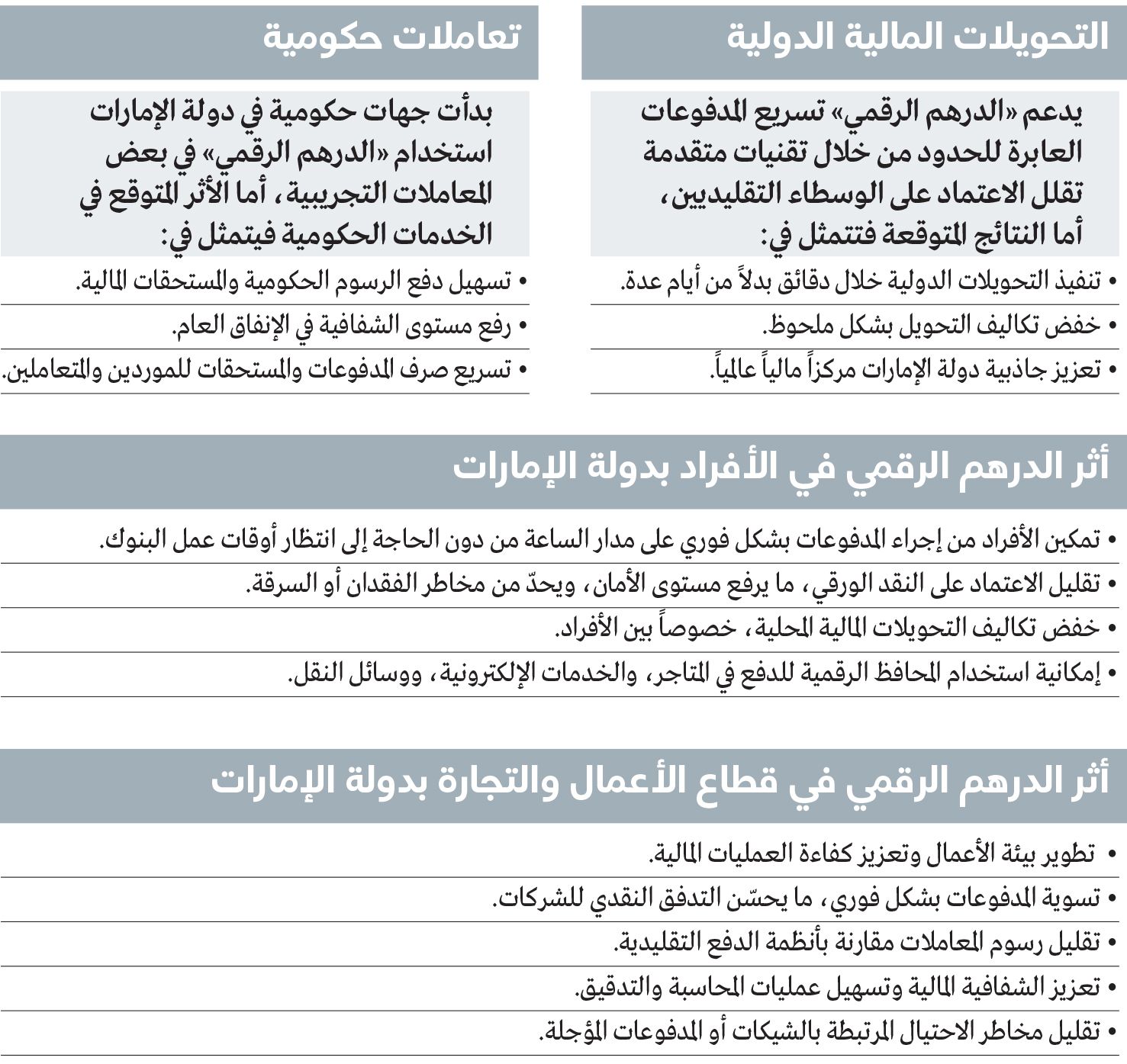 وتشير التوقعات إلى بدء استخدام «الدرهم الرقمي» (وهو العملة الرقمية للمصرف المركزي، وله قوة العملة الوطنية المستخدمة حالياً نفسها)، في المعاملات التجارية تدريجياً خلال العام المقبل 2026، بعد أن تم تجريبه في معاملات حكومية تمت بسرعة كبيرة وبلا مخاطر.