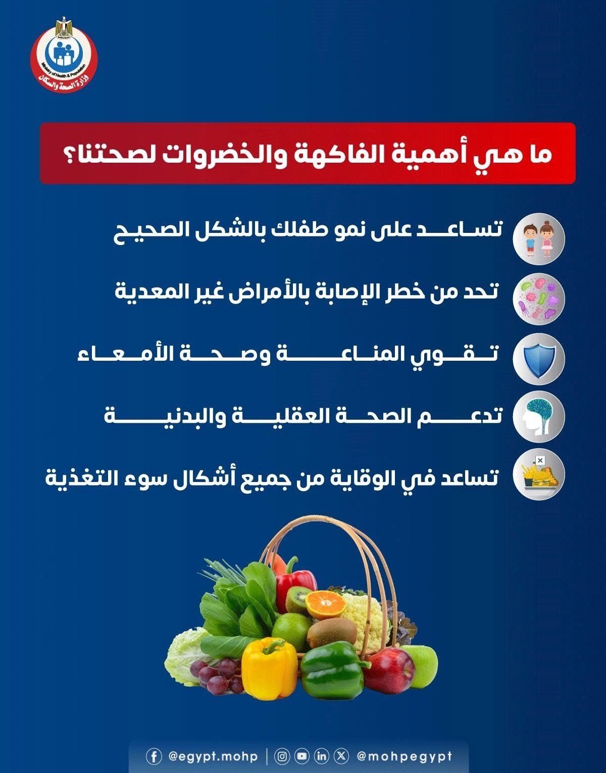 وقالت وزارة الصحة والسكان :تناول الفاكهة والخضروات يحد من خطر الإصابة بالأمراض غير المعدية ويقوى المناعة وصحة الأمعاء .