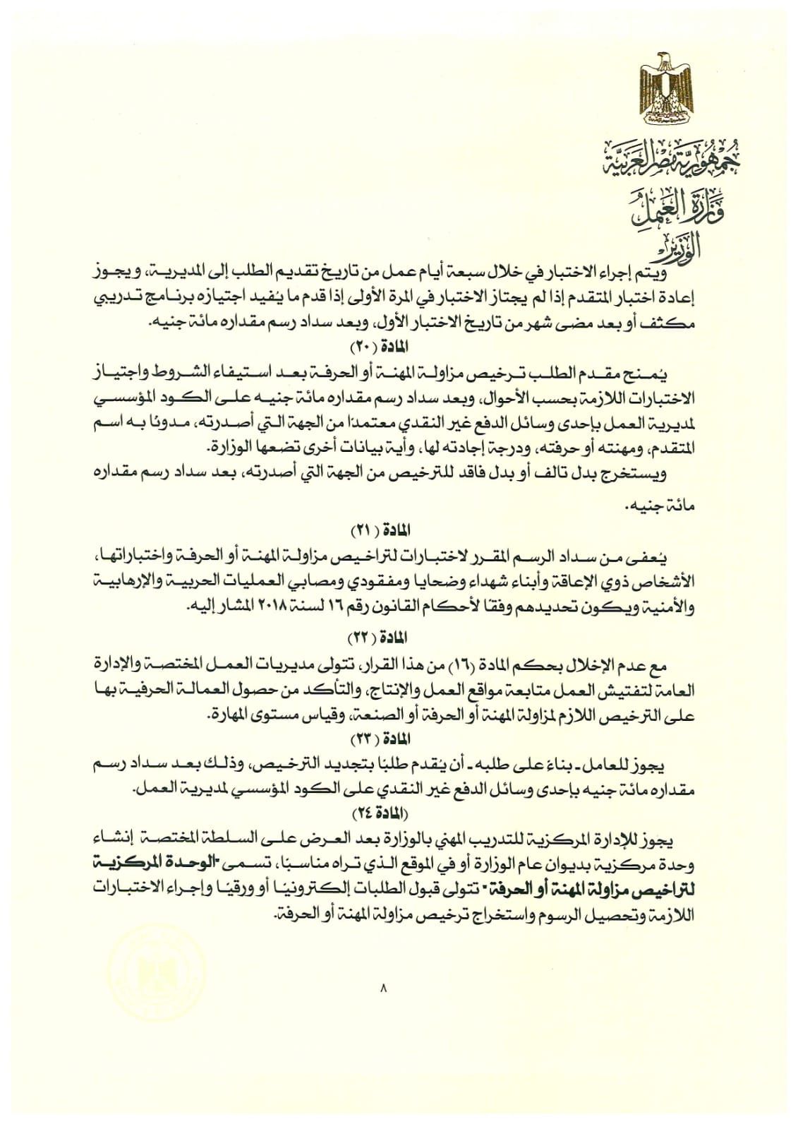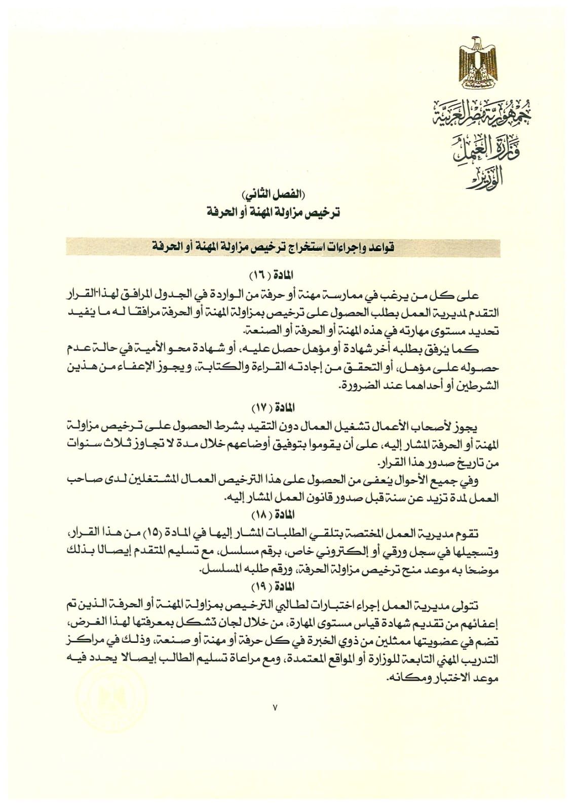 وأضاف الوزير، أن القرار ينظم كذلك قواعد وإجراءات ترخيص مزاولة المهن والحرف، بما يحقق الانضباط المهني داخل سوق العمل، ويرفع جودة الخدمات المقدمة، مع منح فترات توفيق أوضاع لأصحاب الأعمال، ومراعاة الحالات المستثناة، والإعفاء من الرسوم للأشخاص ذوي الإعاقة وأبناء الشهداء ومصابي العمليات الحربية والإرهابية، دعمًا للبعد الاجتماعي... وأكد وزير العمل أن هذا القرار يُعد خطوة محورية في بناء منظومة مهارات وطنية حديثة، تدعم خطط الدولة للتنمية البشرية، وتُعزز تنافسية العامل المصري محليًا ودوليًا، مشددًا على استمرار الوزارة في إصدار ونشر وشرح القرارات التنفيذية لقانون العمل الجديد، بما يحقق الاستقرار الوظيفي، ويحسن بيئة العمل، ويدعم الاقتصاد الوطني.