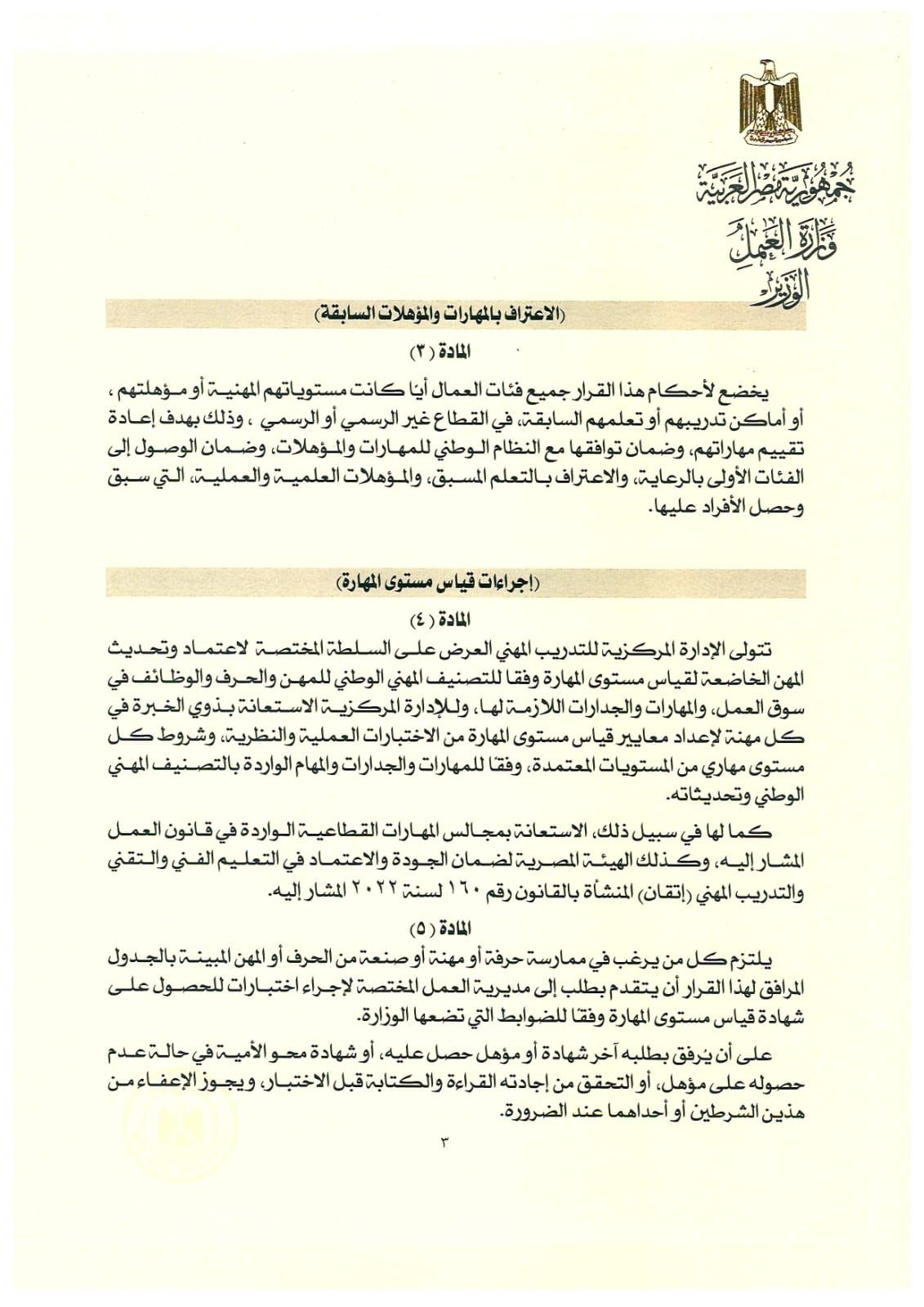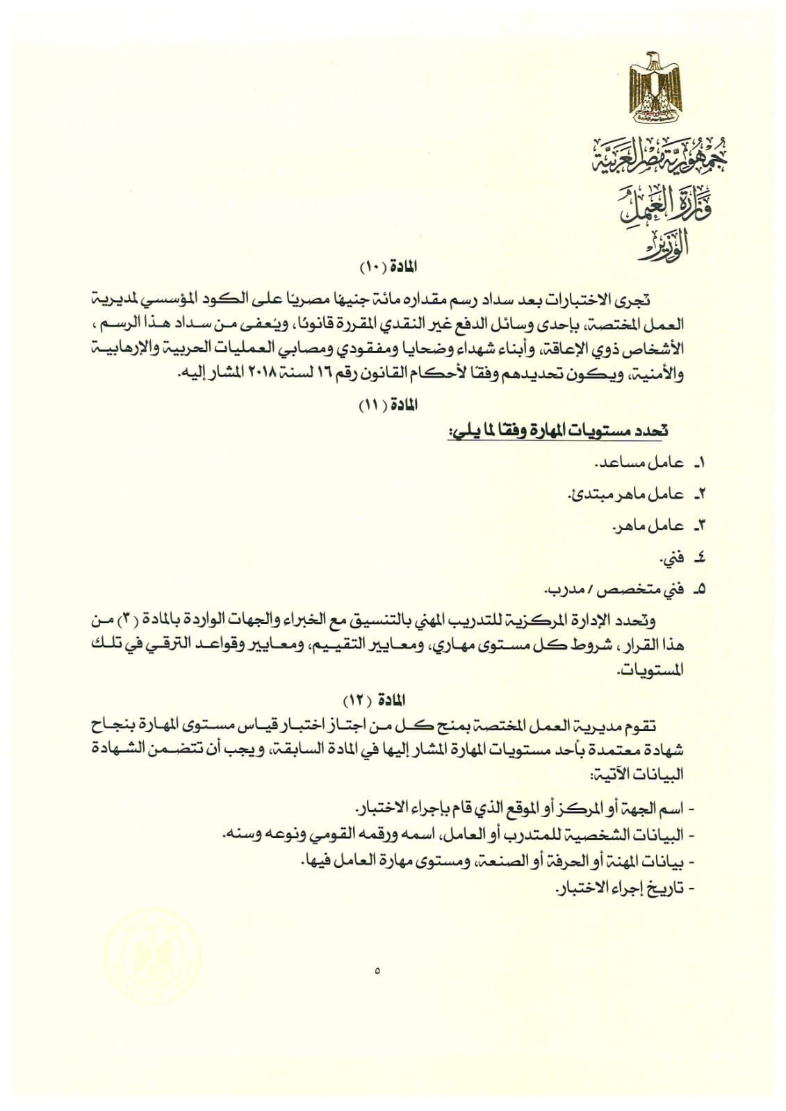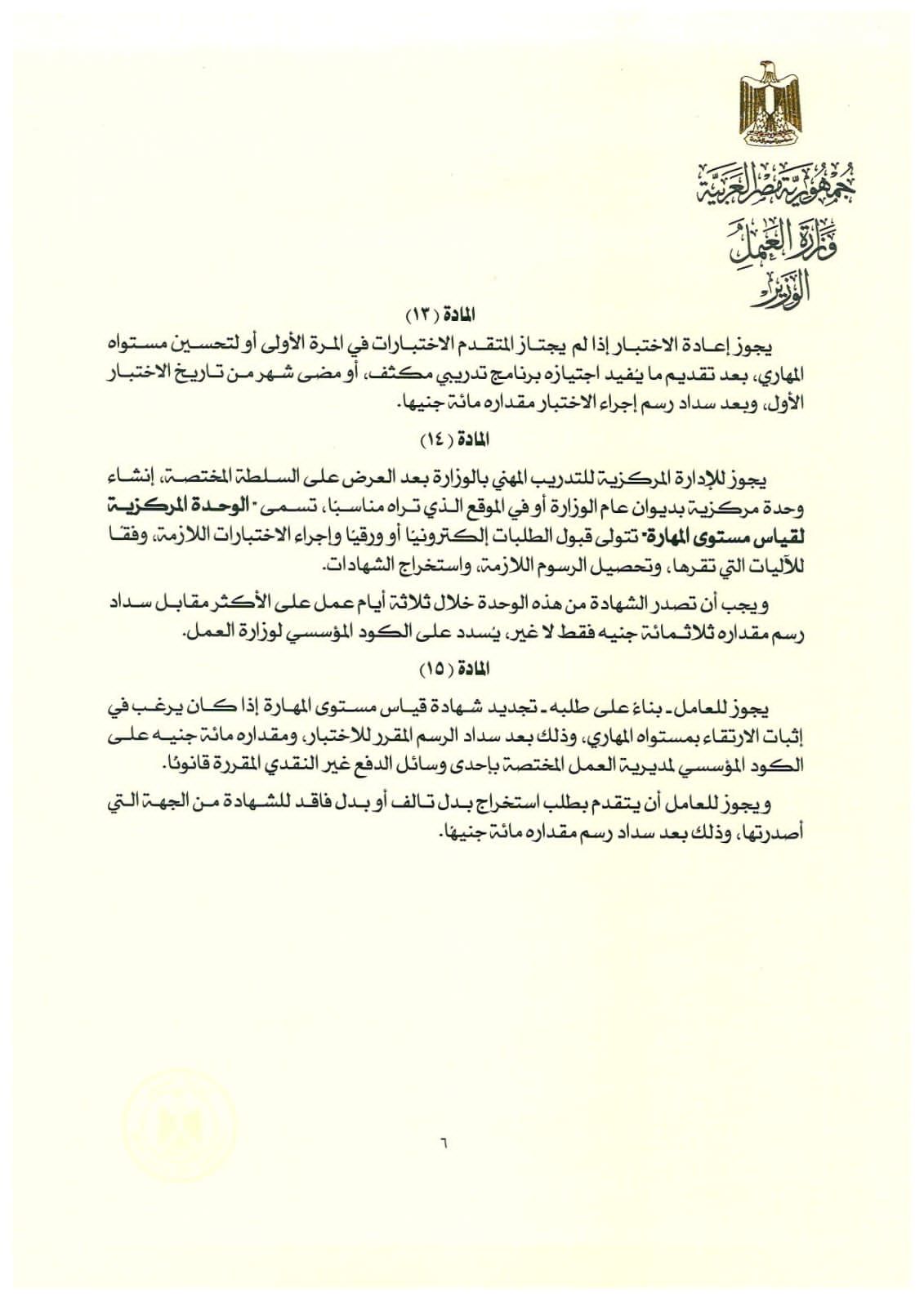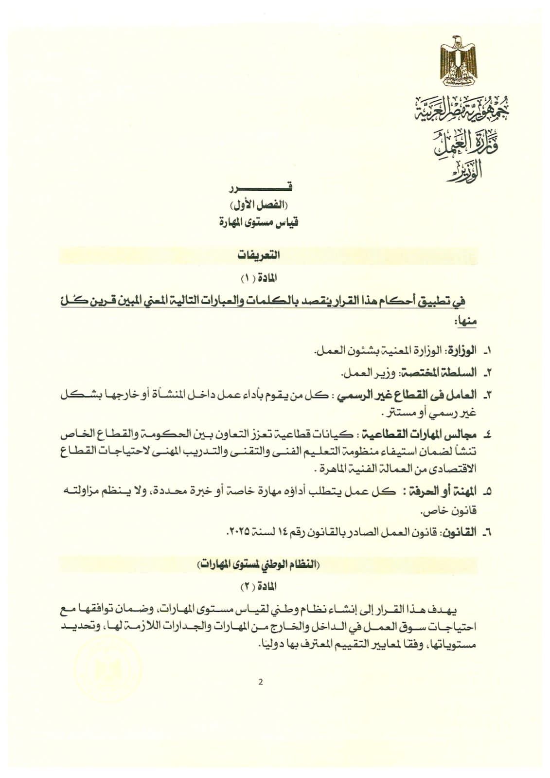 يلتزم كل من يرغب في ممارسة حرفة أو مهنة أو صنعة من الحرف أو المهن المبينة بالجدول المرافق لهذا القرار أن يتقدم بطلب إلى مديرية العمل المختصة لإجراء اختبارات للحصول على شهادة قياس مستوى المهارة وفقًا للضوابط التي تضعها الوزارة.