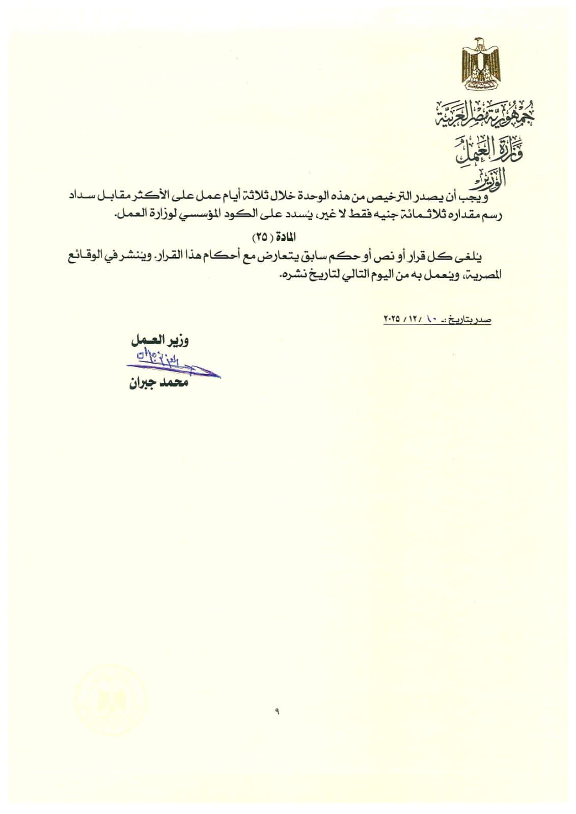 ويجب أن يصدر الترخيص من هذه الوحدة خلال ثلاثة أيام عمل على الأكثر مقابل سداد رسم مقداره ثلاثـمائة جنيه فقط لا غير، يُسدد على الكود المؤسسي لوزارة العمل.