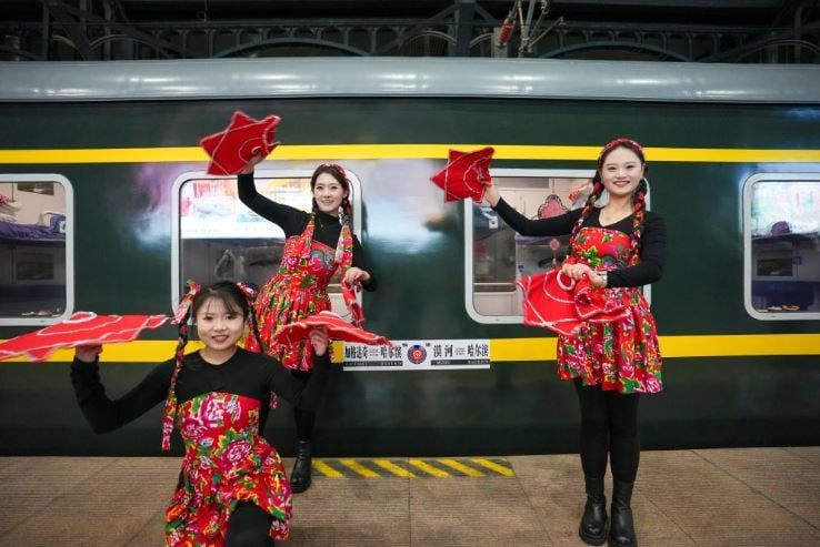انطلق القطار رقم "K7041"، والذى يعد أول قطار يحمل طابع الثقافة الشعبية لشمال شرقي ويتم تشغيله، من محطة هاربين للسكك الحديدية متوجها إلى مدينة موخه.