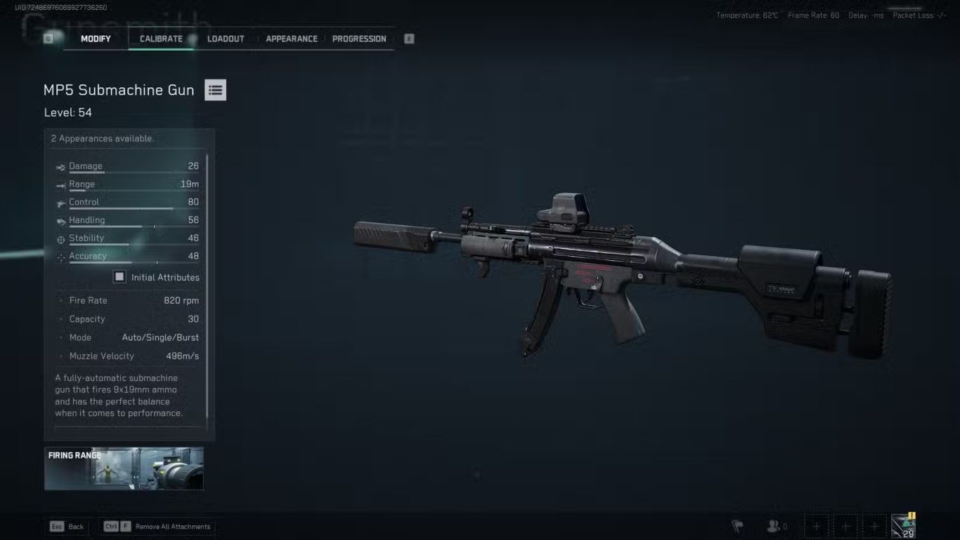 يمتلك سلاح MP5 معدل إطلاق أساسي يبلغ ثمانمئة وعشرين طلقة في الدقيقة مما يجعله يهتز بشكل غير منتظم عند الإطلاق التلقائي الكامل. لا تكمن المشكلة الأساسية في ضعف التحكم في الارتداد بقدر ما تكمن في انخفاض الثبات. يمكن التحكم في ارتداد السلاح نسبيا لكن حتى مع منع ارتفاع الفوهة أو انحرافها يظل السلاح ينثر الطلقات داخل نطاق مخروطي واسع نتيجة ضعف الثبات. يعالج هذا البناء هذه المشكلة عبر تضييق نمط الارتداد وجعل الطلقات أكثر تركزا.