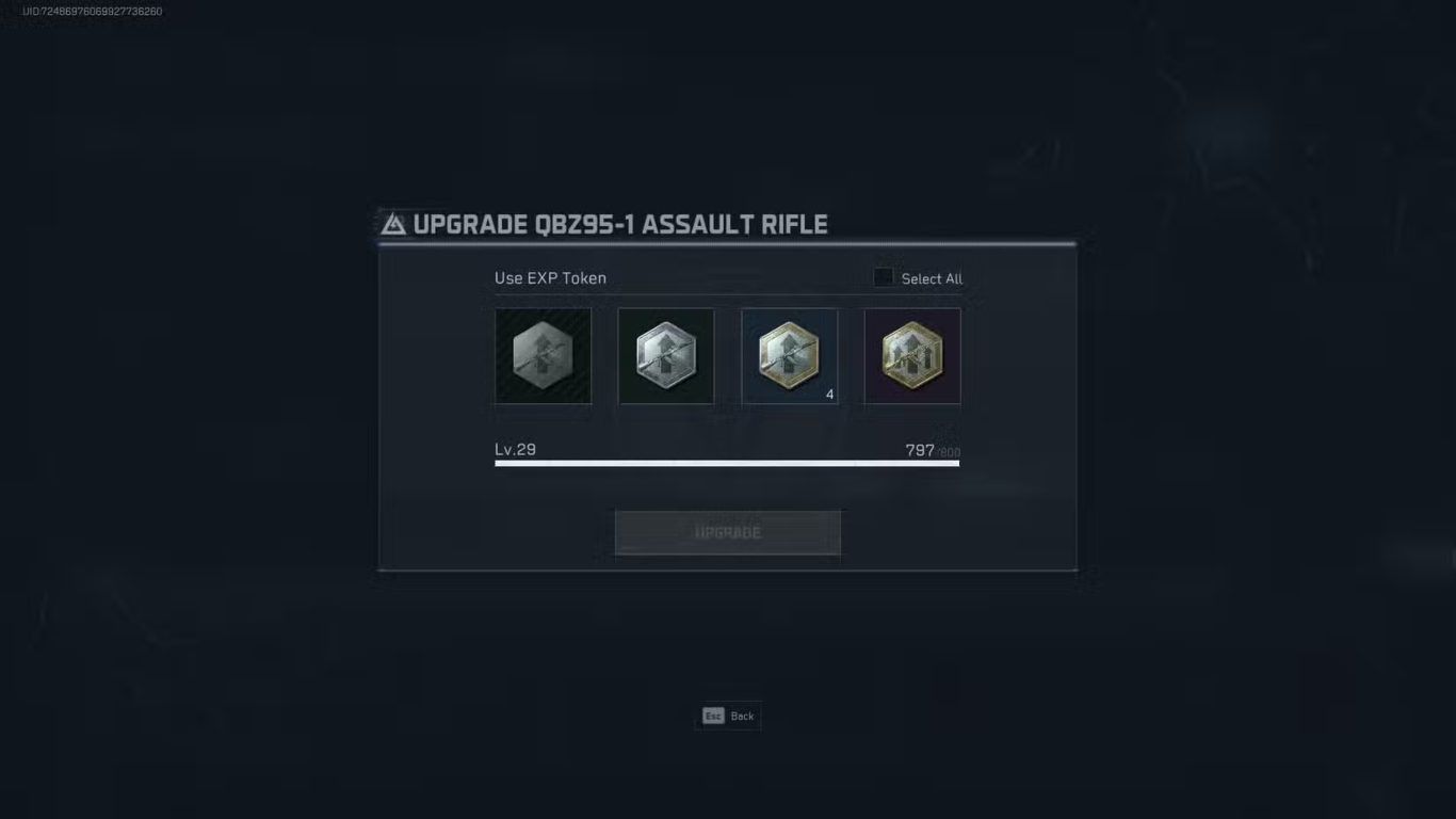 لاستخدام الرموز التي تم الحصول عليها يتم التوجه إلى شاشة Loadout ثم اختيار السلاح المراد ترقيته. يتم تعديل السلاح ثم الانتقال إلى تبويب Progression وبعد ذلك يتم الضغط على زر Upgrade ثم تحديد عدد رموز الخبرة المراد استخدامها.