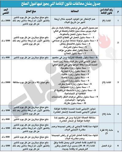 وأوضحت المادة 13 فقرة 5 أنه يتم فرض غرامة دينارين يوميا بأول شهر ثم 4 يوميا بحد أقصى 1200، والعمالة المنزلية ديناران يوميا وحدها الأقصى 600 دينار عند انتهاء مدة إقامة الأجنبي أو رفض تجديدها وعدم مغادرته البلاد.