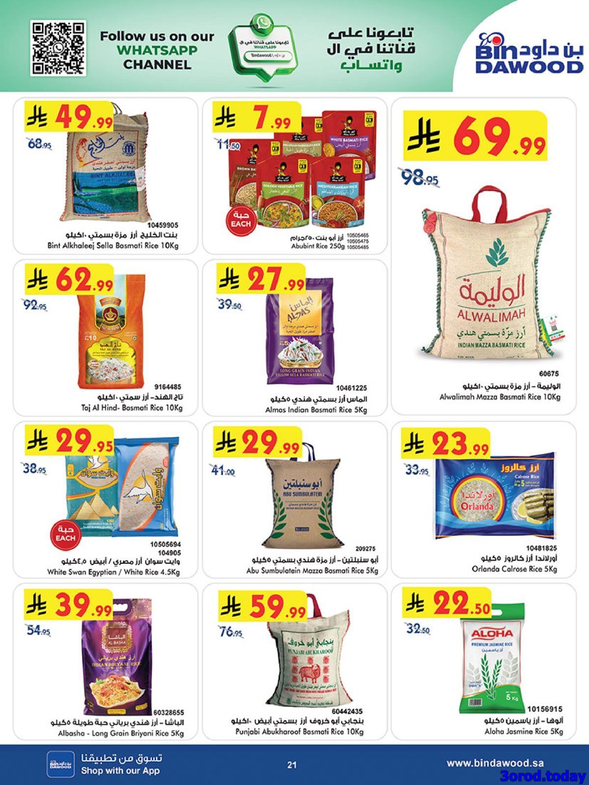 عروض بن داود الاسبوعية الأربعاء 31/12/2025 الموافق 11 رجب 1447هـ تشمل الأرز البسمتي والبرغل والفريك والفاصوليا والذرة الصفراء وزيت الزيتون و زيوت الطعام وصلصة الطماطم وتشكيلة من اللحوم و الخضروات وبضم ايضا الأجهزة مثل محضر عصائر ومروحة عمودية وسخان ماء وفرن كهربائي و ميكروويف ومضرب بيض باسعار مناسبة
