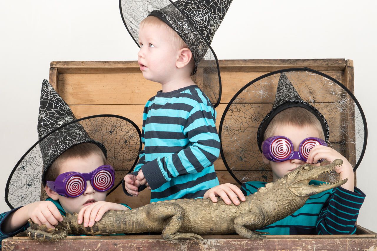 • تمثال التمساح: يمسك الأطفال بمجسم لتمساح يبدو واقعياً بلون بني/زيتي، مما يعطي إيحاءً بأنهم "صيادون" أو "سحرة"؛ يتعاملون مع حيوانات غريبة.