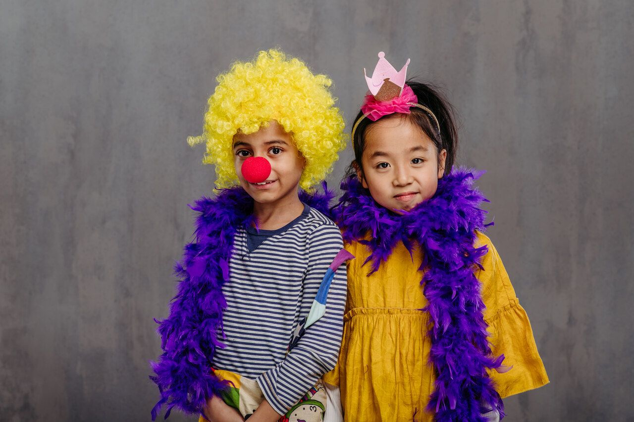 يمكنك اعتماد ملابس تنكرية للأطفال أو ملابس عرض مرحة، تتسم بالألوان الزاهية والأنماط المتعددة. إليكِ شرحاً مفصلاً لملابس طفليكِ: