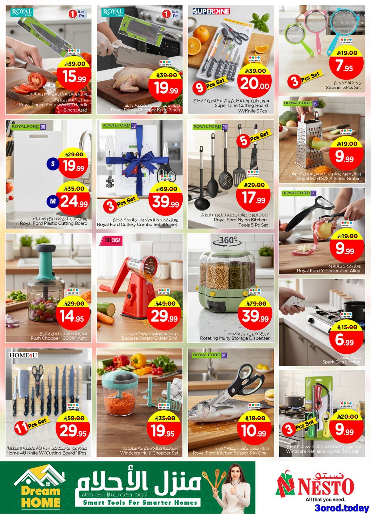 تشمل عروض نستو الرياض هذا الاسبوع علي : طقم أدوات مطبخ نايلون رويال فورد – مبشرة رويال فورد 4 جوانب – قشارة رويال فورد – مفرمة ضغط – مبشرة دوارة ديلكاسا – موزع تخزين دوار – ولاعة إشعال – مفرمة ويندسيرا متعددة – مقص مطبخ رويال فورد – طقم سكاكين هوم فور يو مع لوح تقطيع – طقم ولاعات ويندسيرا – بطاطس مقلية