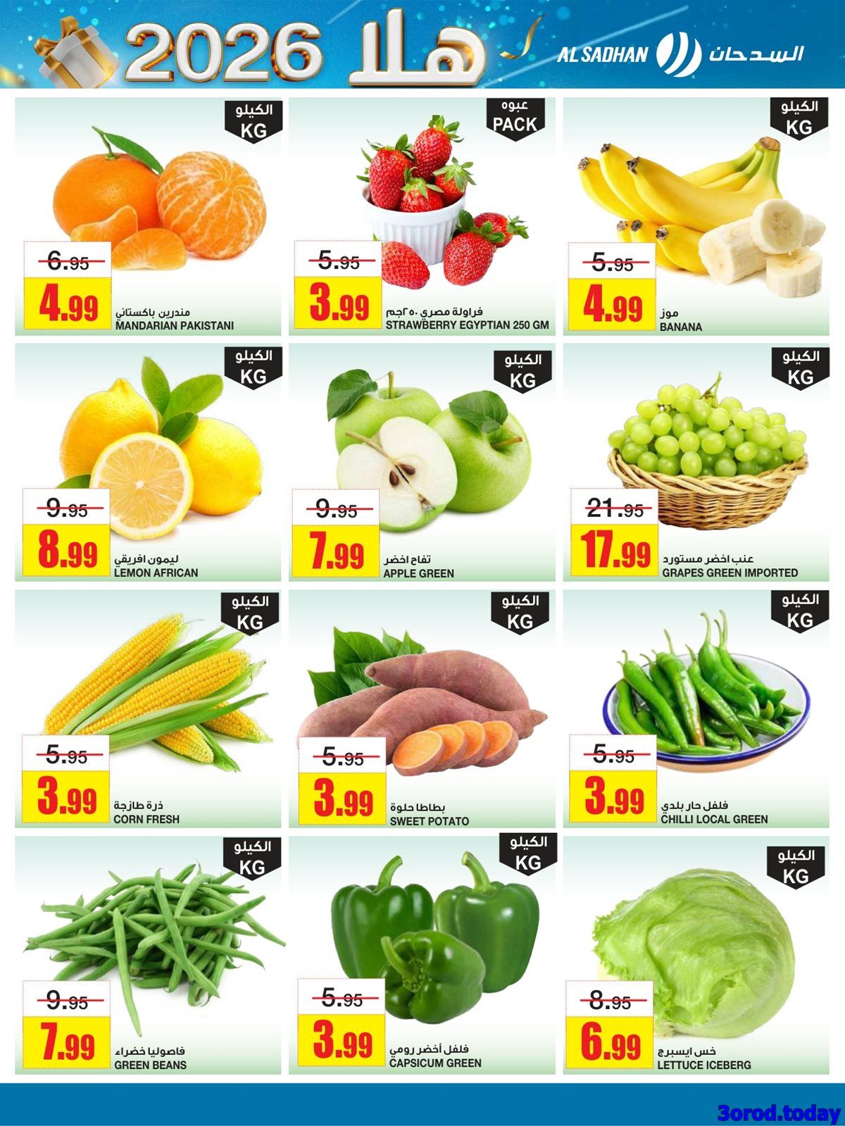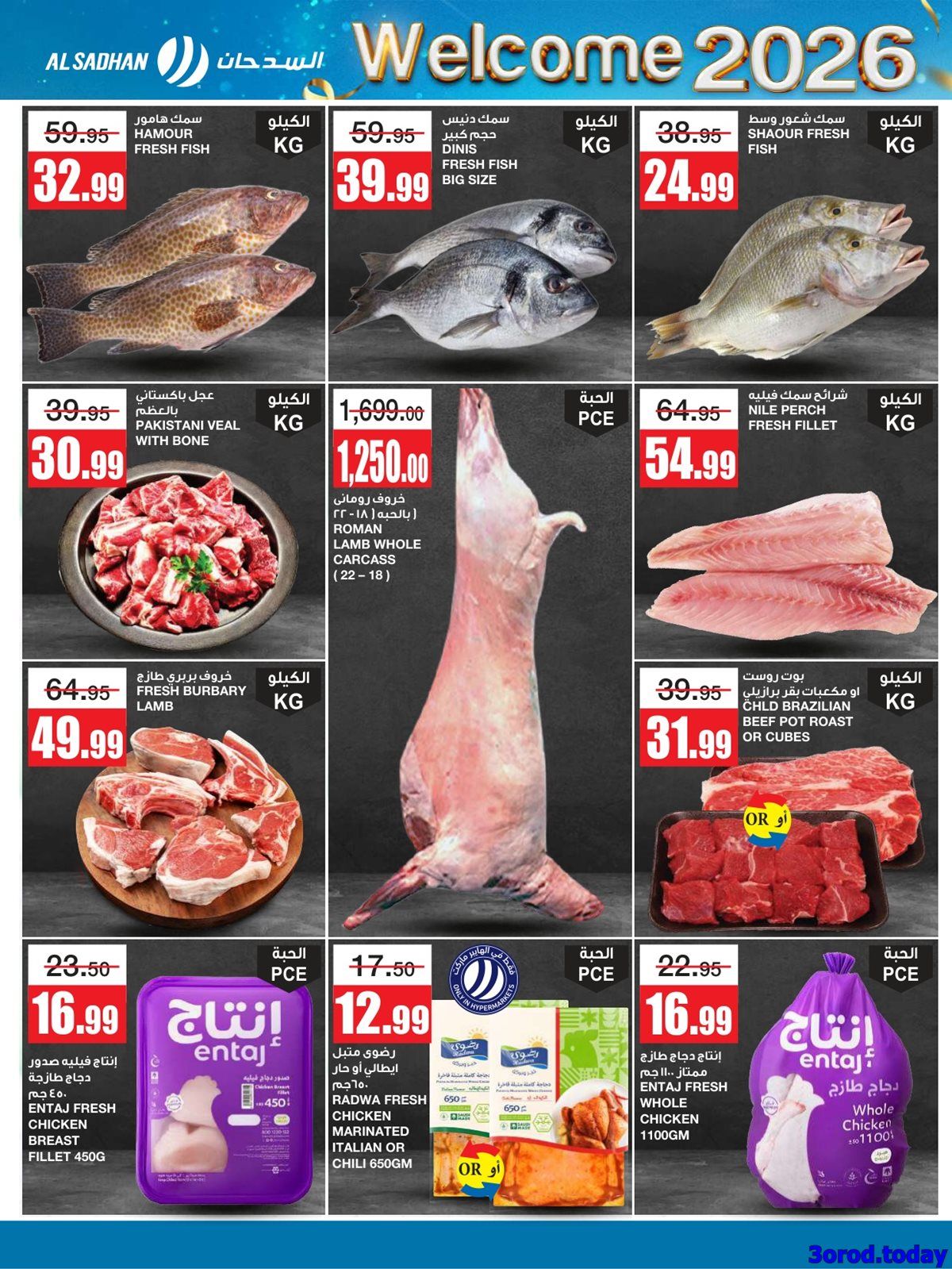 عروض السدحان الأسبوعية الأربعاء 11 رجب 1447هـ الموافق 31-12-2025 تعرض مجموعة غذائية تحتوي على الأرز والمعكرونة الكاملة والعدس والفاصوليا البيضاء وصلصة البيستو ثم توفر تشكيلة من الأجهزة المنزلية و المنتجات الاستهلاكية و التوابل و يضم ايضا اصناف اللحوم الطازجة و غيرها من المنتجات باقل الاسعار المناسبة للجميع