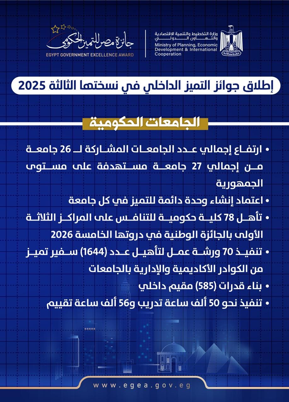 الجامعات الحكومية: في إطار تعزيز الشراكة الاستراتيجية بين الجائزة والمجلس الأعلى للجامعات لتعزيز التميز المؤسسي، شهد عام 2025 توسّعًا ملحوظًا في منظومة التميّز الداخلي بالجامعات، حيث انضمت للمرة الأولى 13 جامعة، إضافةً إلى 13 جامعة سبق لها المشاركة في الدورات السابقة، كما ارتفع إجمالي عدد الجامعات المشاركة في النسخة الحالية إلى 26 جامعة حكومية من إجمالي 27 جامعة مستهدفة على مستوى الجمهورية.