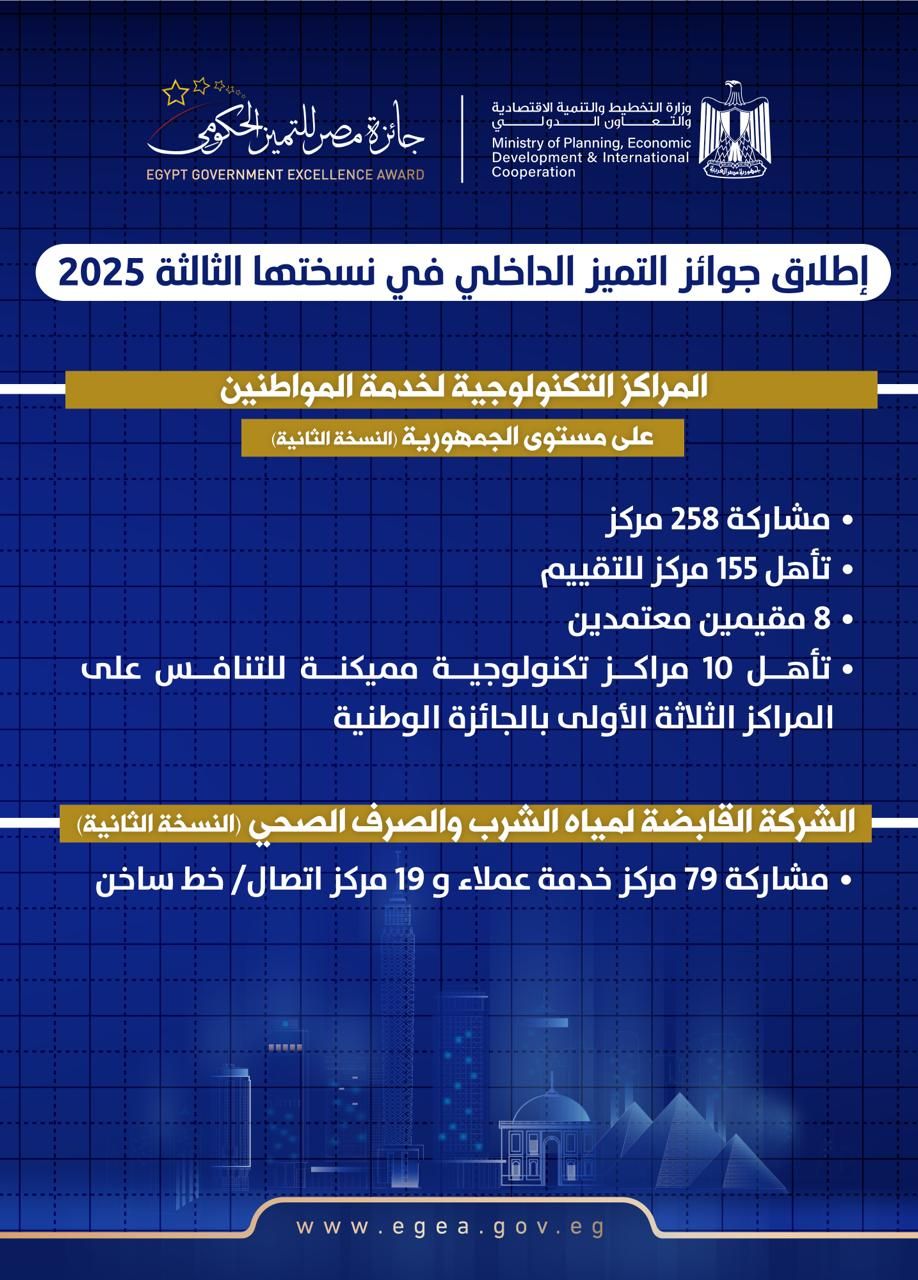 المراكز التكنولوجية لخدمة المواطنين على مستوى الجمهورية (النسخة الثانية): شارك في 2025 عدد 258 مركز تكنولوجي لخدمة المواطنين على مستوى الجمهورية وتأهل 155 مركز للتقييم، بمشاركة 8 مقيمين معتمدين ورئيس فريق تقييم من جائزة مصر للتميز الحكومي. وتأهل 10 مراكز تكنولوجية مميكنة للتنافس على المراكز الثلاثة الأولى بالجائزة الوطنية في دورتها القادمة 2026.
